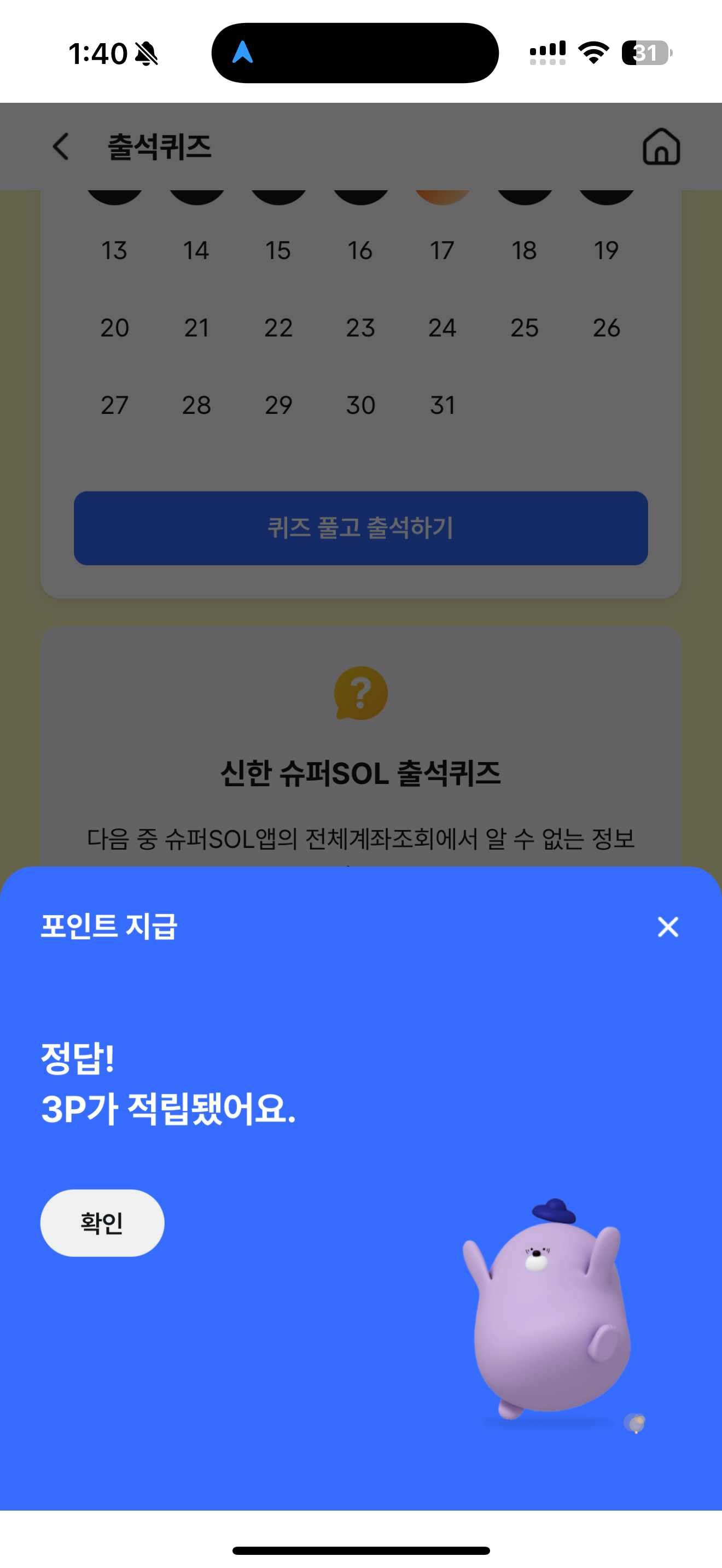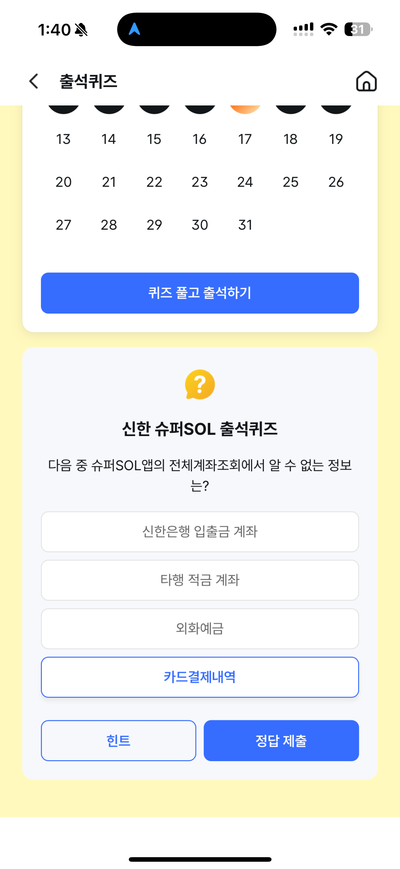 신한 슈퍼SOL 출석퀴즈 정답은 카드결제내역 입니다