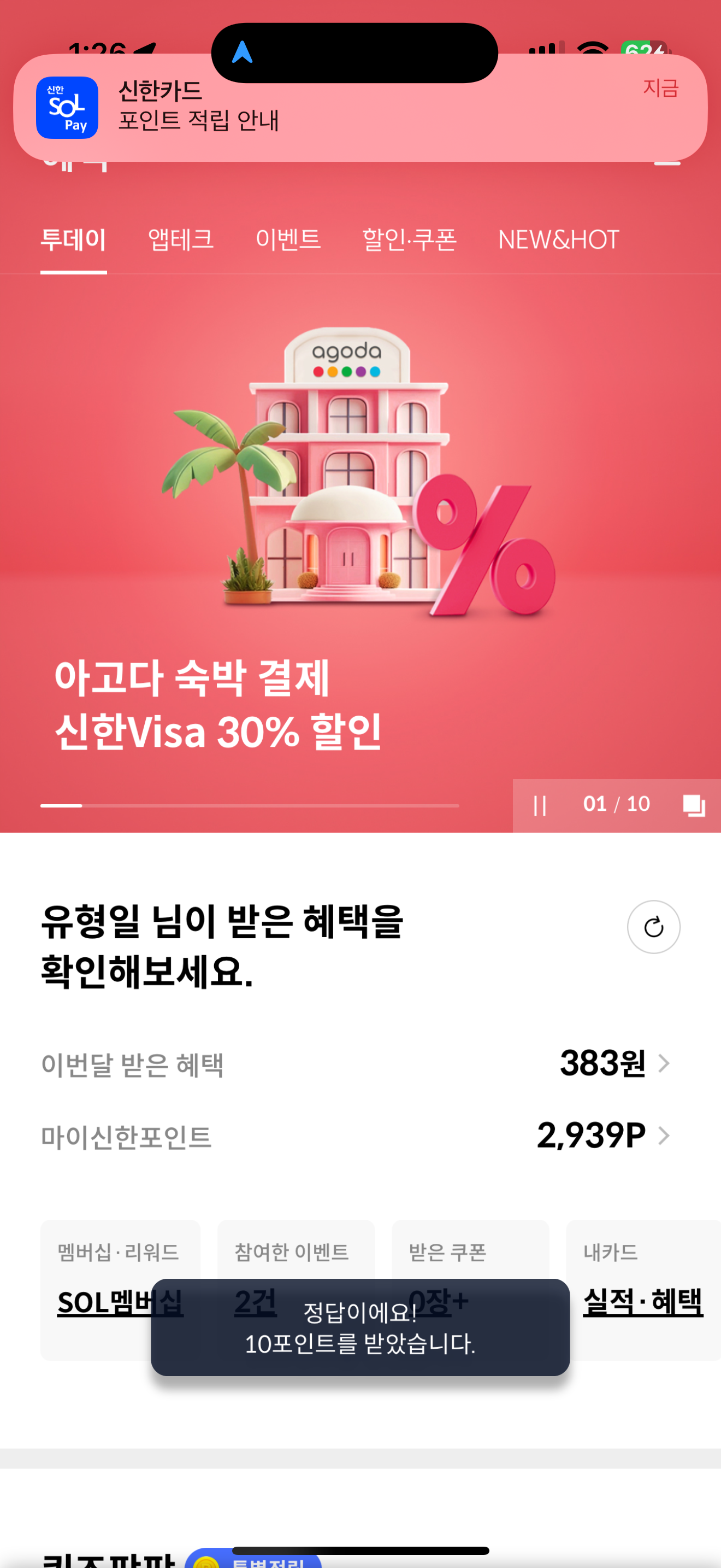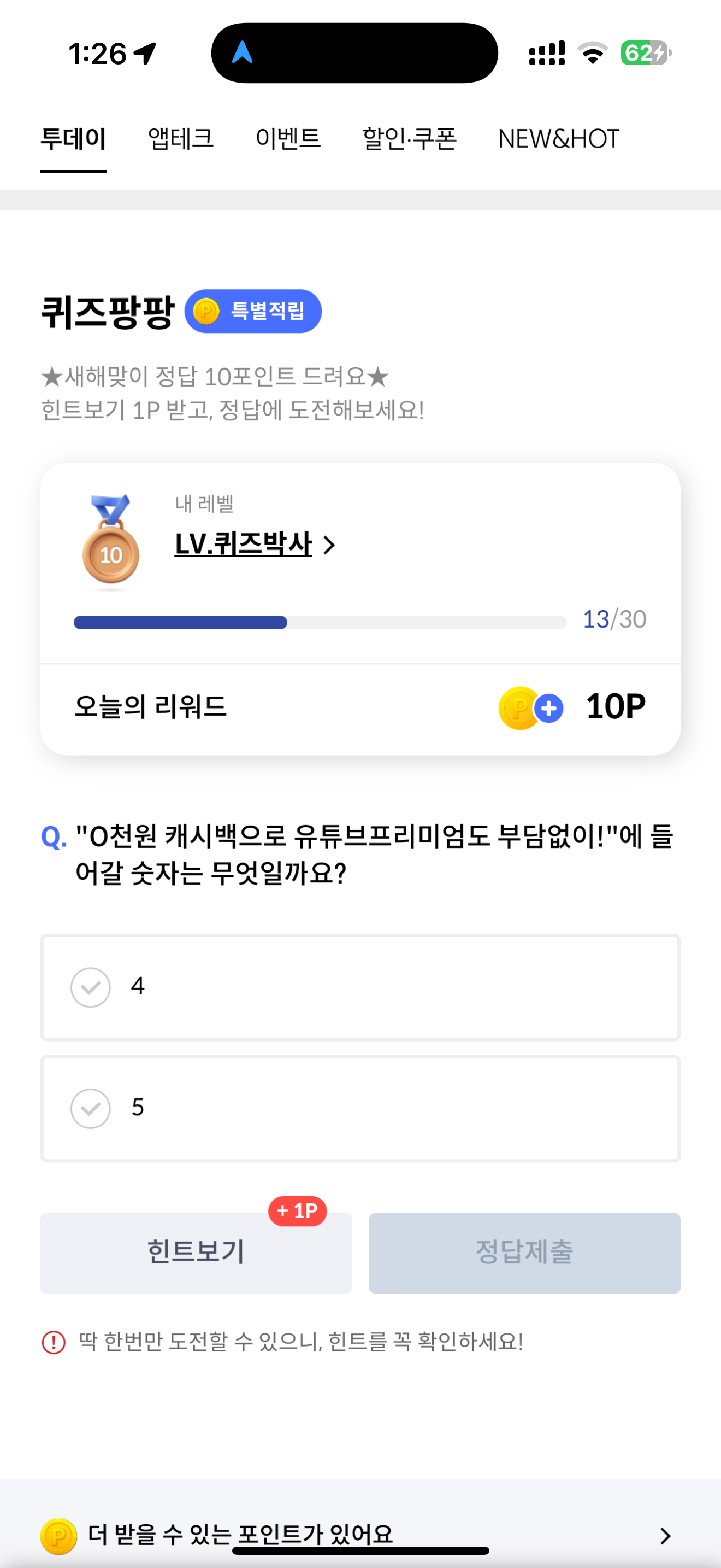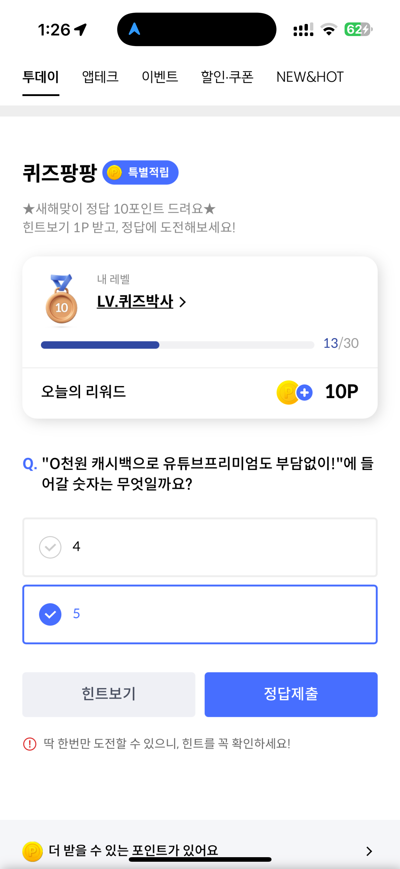 신한카드 퀴즈팡팡 정답은 5 입니다