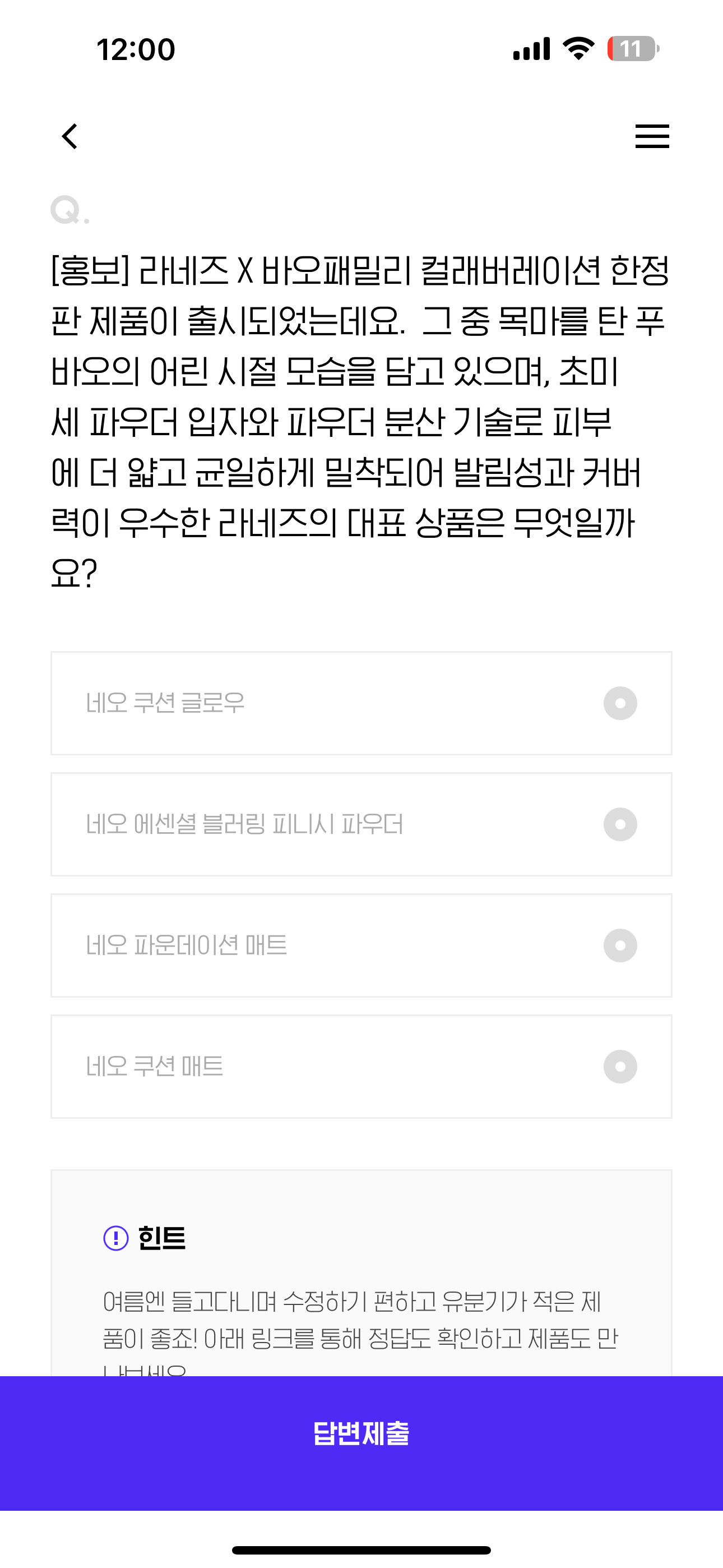 [홍보] 라네즈 X 바오패밀리 컬래버레이션 한정판 제품이 출시되었는데요. 그 중 목마를 탄 푸바오의 어린 시절 모습을 담고 있으며, 초미세 파우더 입자와 파우더 분산 기술로 피부에 더 얇고 균일하게 밀착되어 발림성과 커버력이 우수한 라네즈의 대표 상품은 무엇일까요? 보기는 1. 네오 쿠션 글로우 2. 네오 에센셜 블러링 피니시 파우더 3. 네오 파운데이션 매트 4. 네오 쿠션 매트 입니다