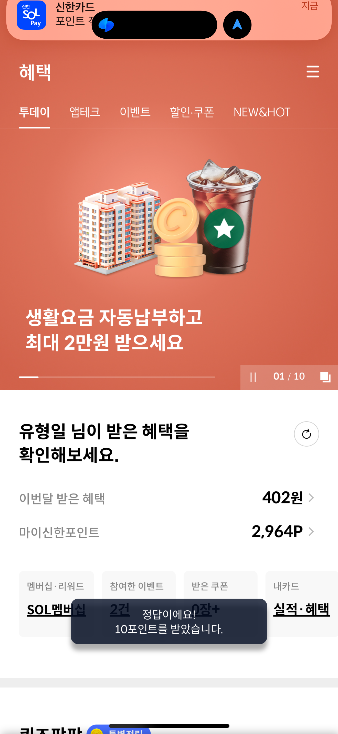 신한카드 퀴즈팡팡 1월 15일 문제입니다