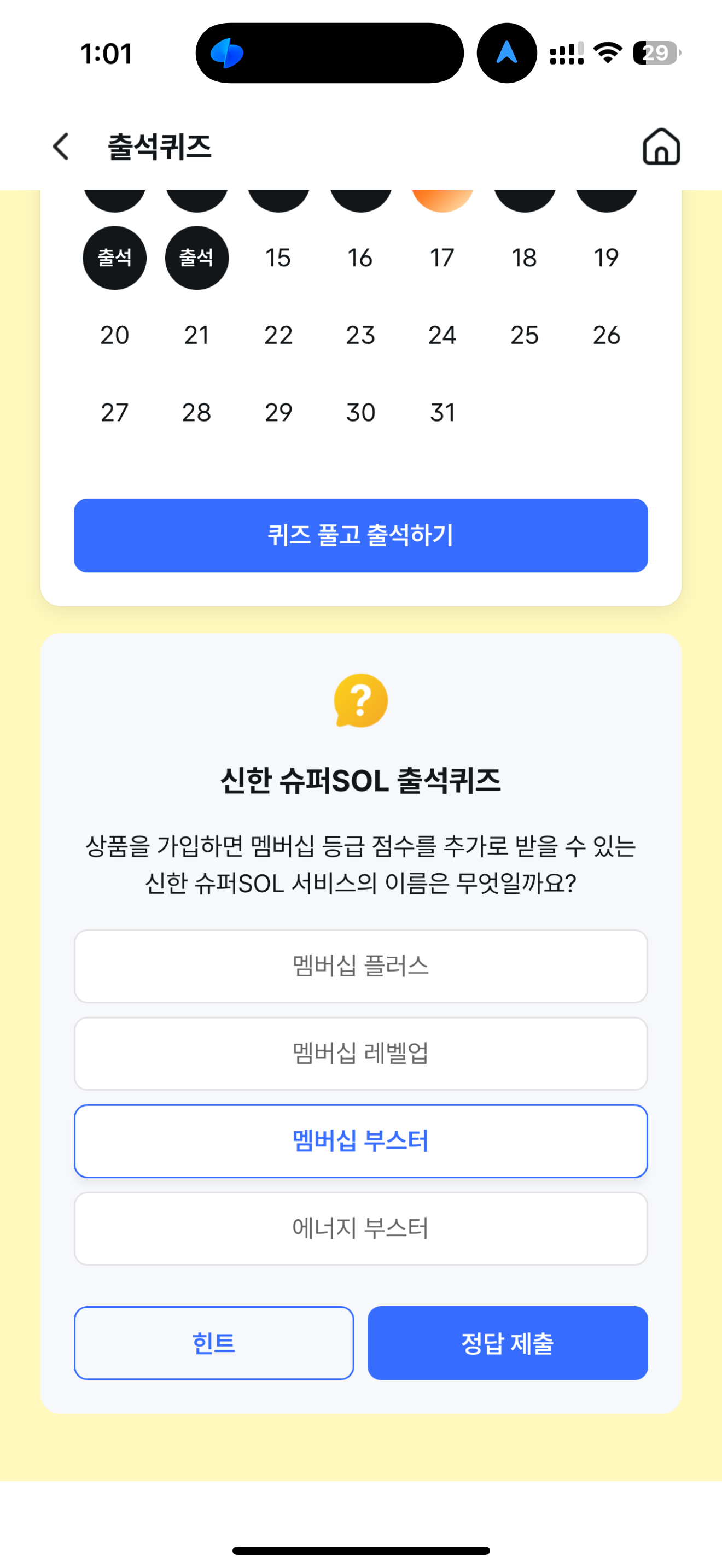 신한 슈퍼SOL 출석퀴즈 정답은 멤버십 부스터 입니다