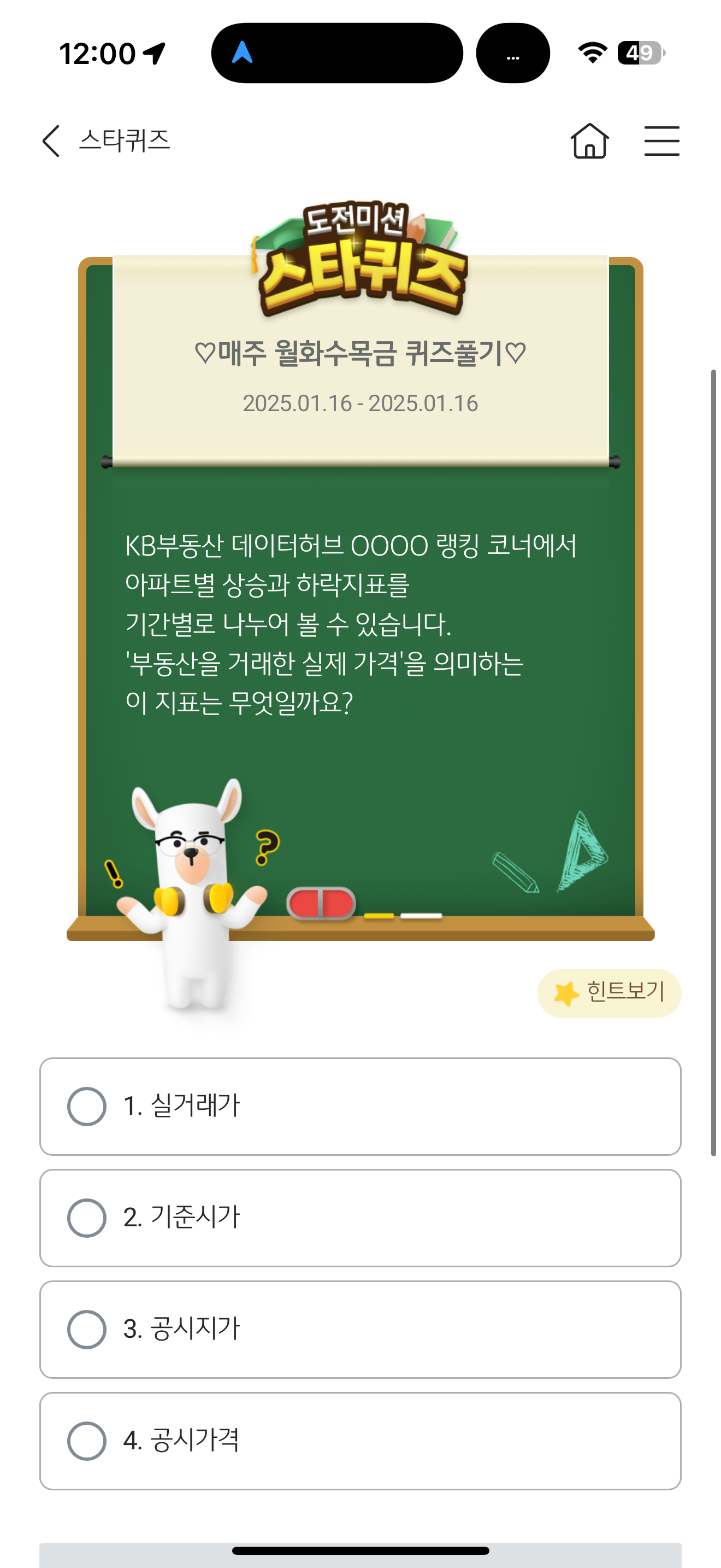 KB스타뱅킹 스타퀴즈 1월 16일 정답(KB부동산 데이터허브 OOOO 랭킹 코너에서 아파트별 상승과 하락지표를 기간별로 나누어 볼 수 있습니다. '부동산을 거래한 실제 가격'을 의미하는 이 지표는 무엇일까요?)