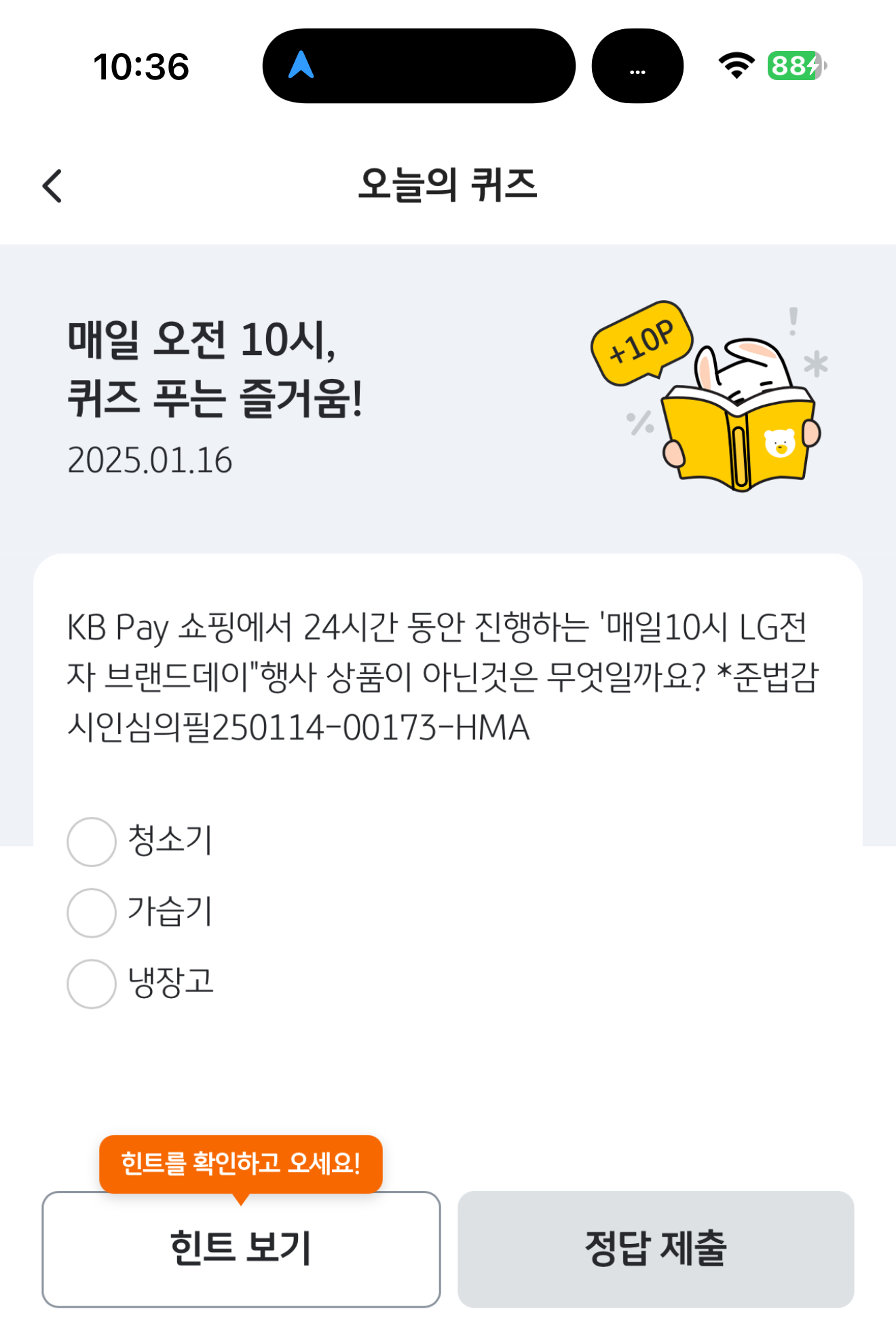 KB Pay 오늘의 퀴즈 1월 16일 문제입니다