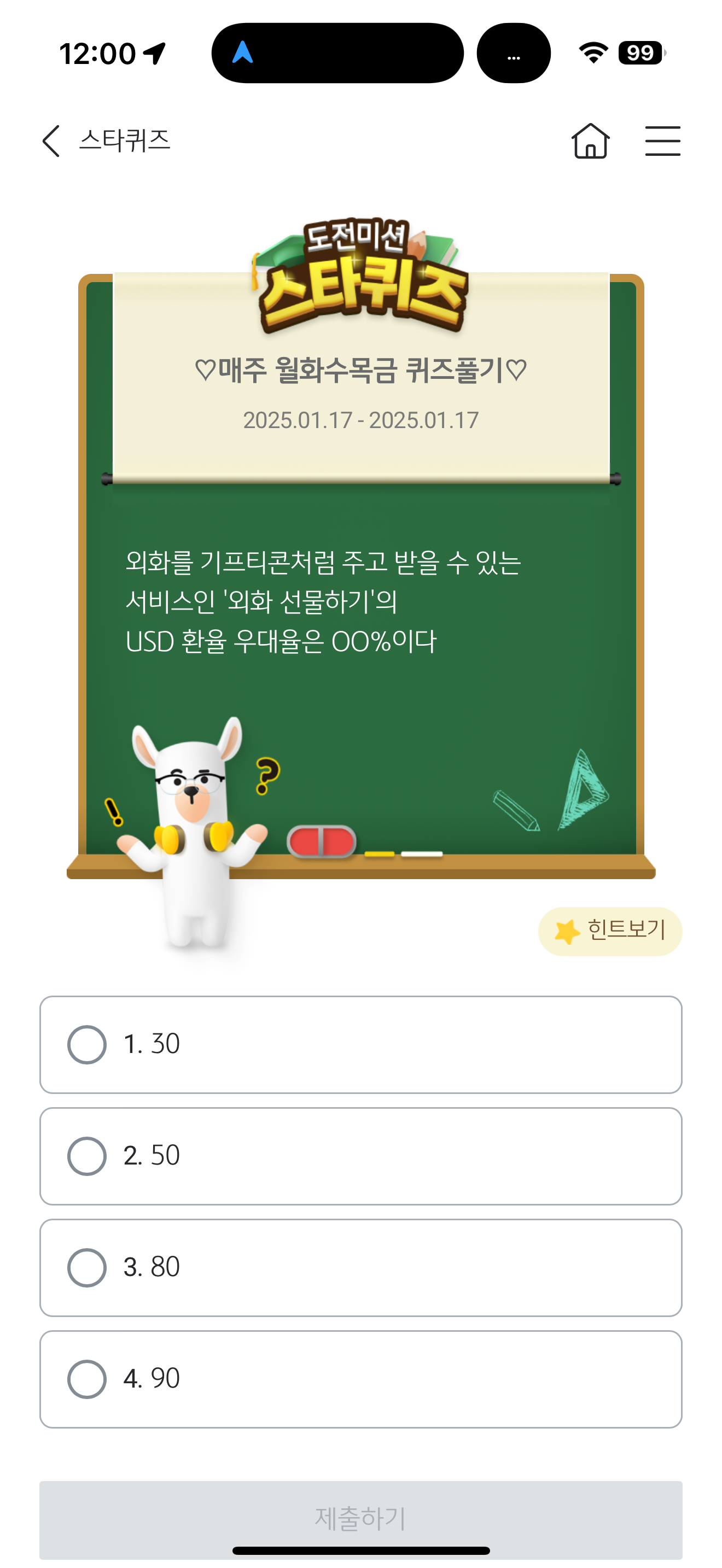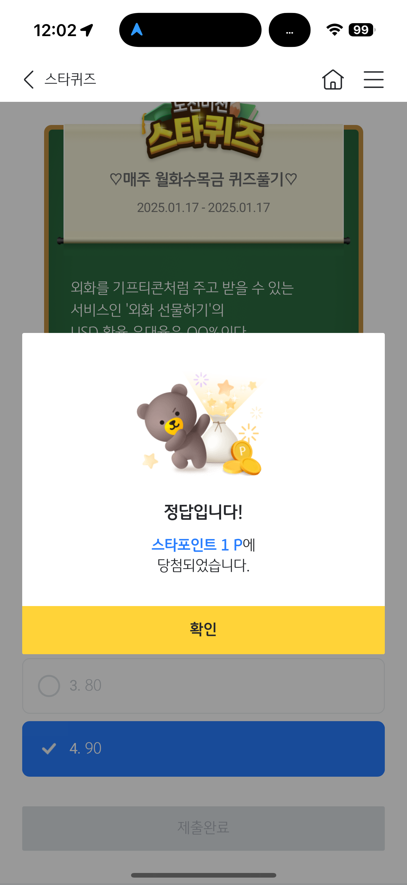 KB스타뱅킹 스타퀴즈 1월 17일 정답(외화를 기프티콘처럼 주고 받을 수 있는 서비스인 '외화 선물하기'의 USD 환율 우대율은 OO%이다)