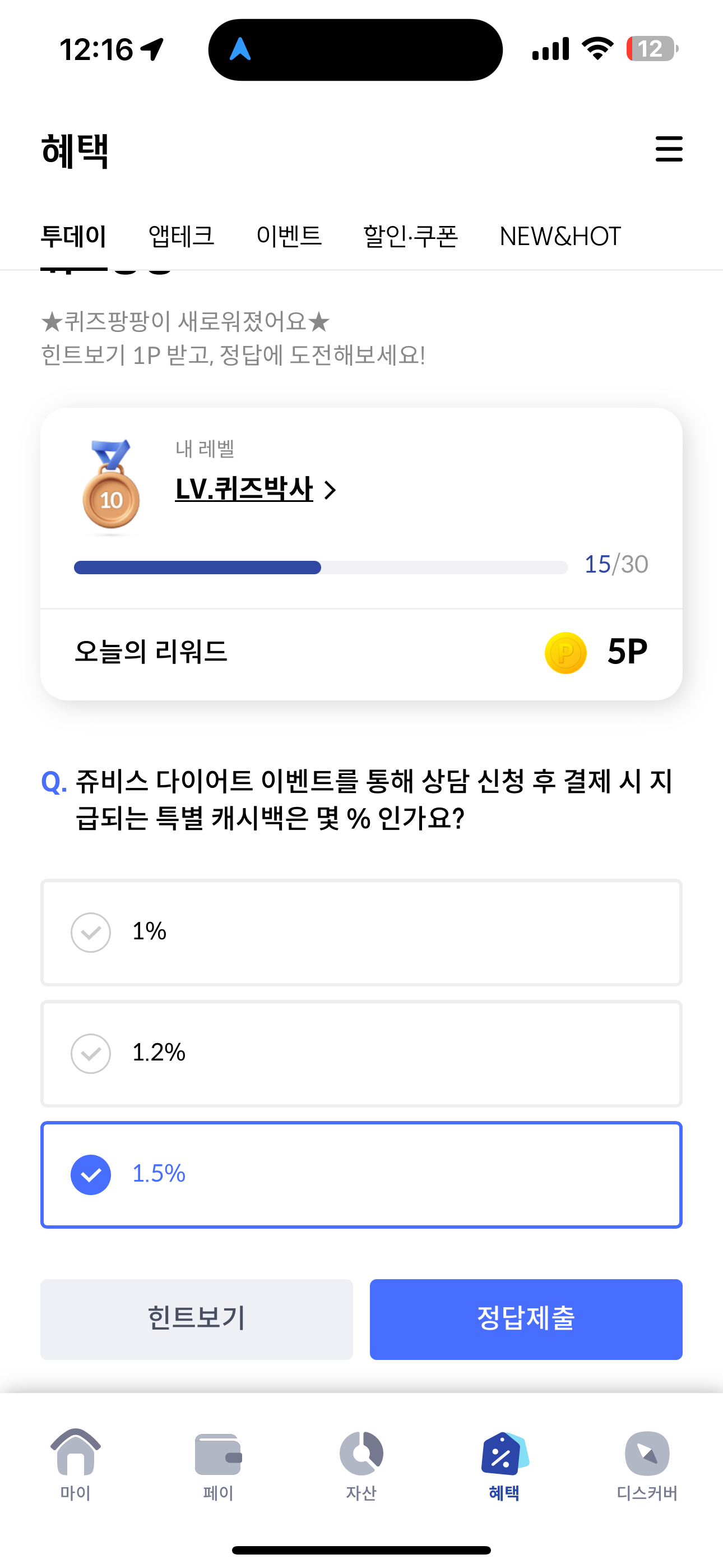 신한카드 퀴즈팡팡 정답은 1.5% 입니다