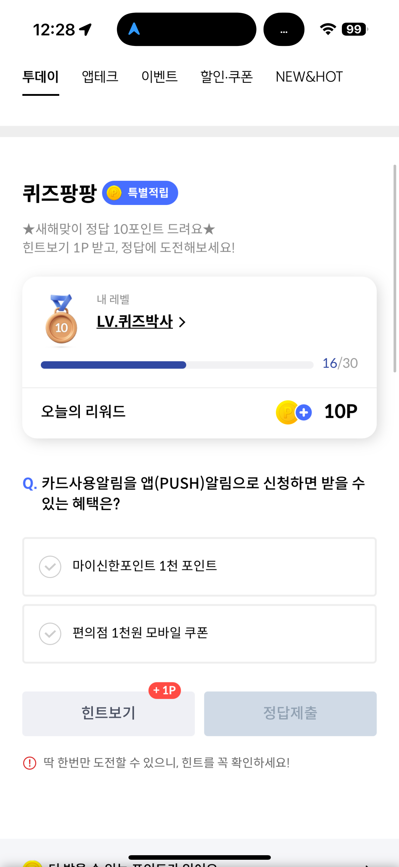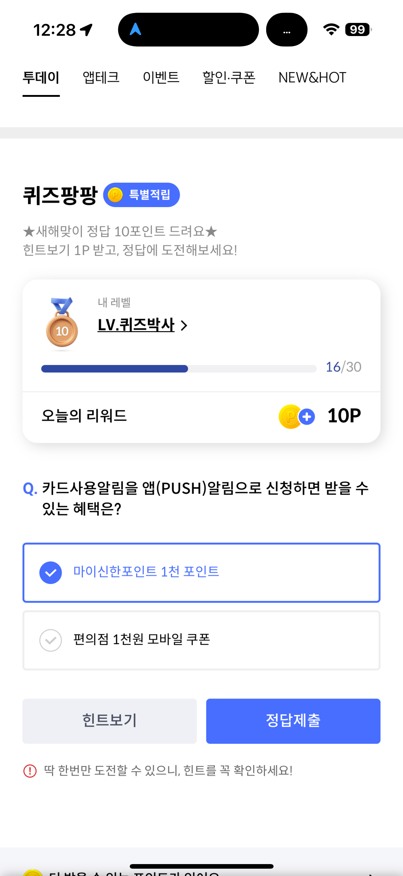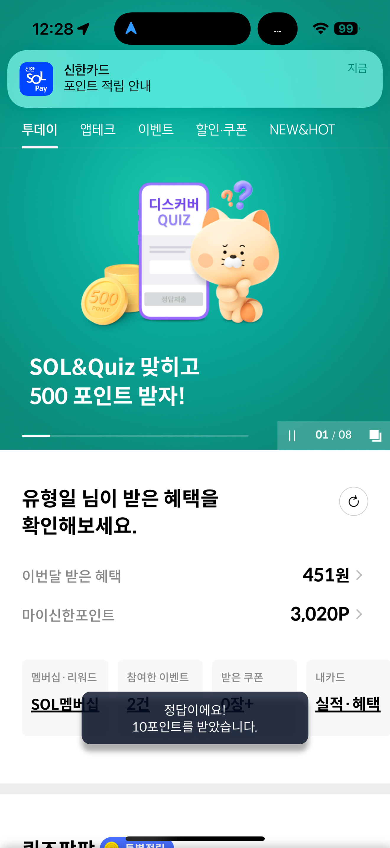 신한카드 퀴즈팡팡 정답은 마이신한포인트 1천 포인트 입니다