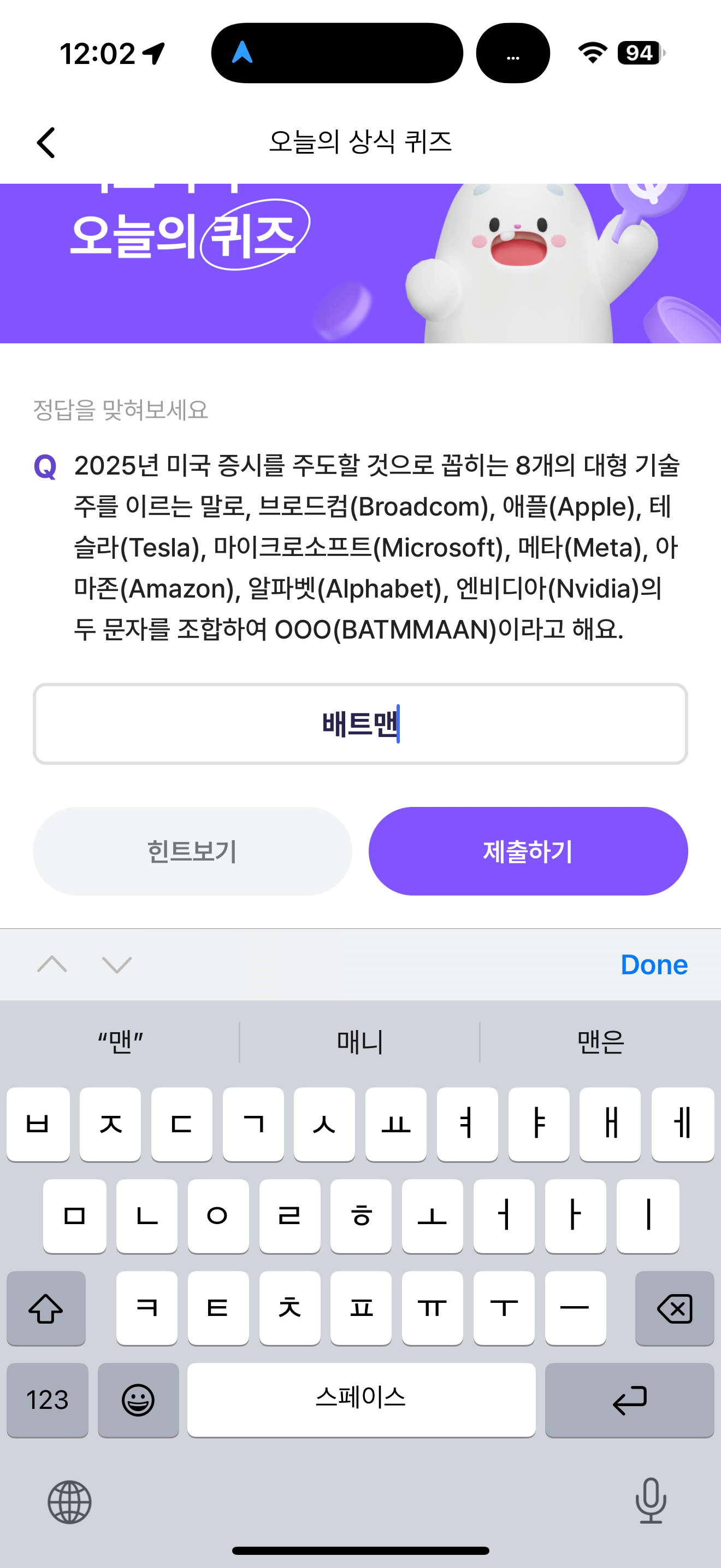 2025년 미국 증시를 주도할 것으로 꼽히는 8개의 대형 기술주를 이르는 말로, 브로드컴(Broadcom), 애플(Apple), 테슬라(Tesla), 마이크로소프트(Microsoft), 메타(Meta), 아마존(Amazon), 알파벳(Alphabet), 엔비디아(Nvidia)의 두 문자를 조합하여 OOO (BATMMAAN)이라고 해요. 주관식 퀴즈인데요.