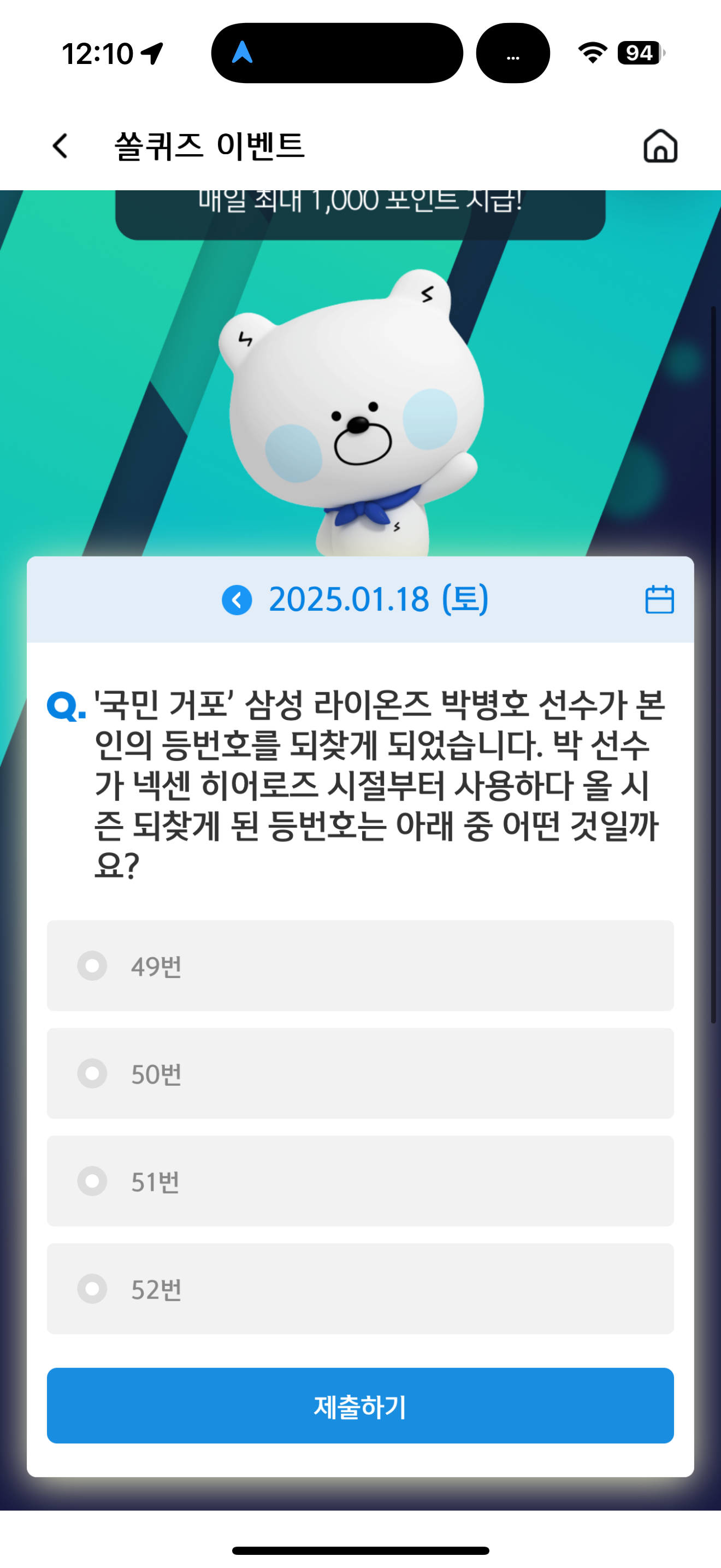 신한 슈퍼SOL 야구/상식 쏠퀴즈 정답은 52번 입니다
