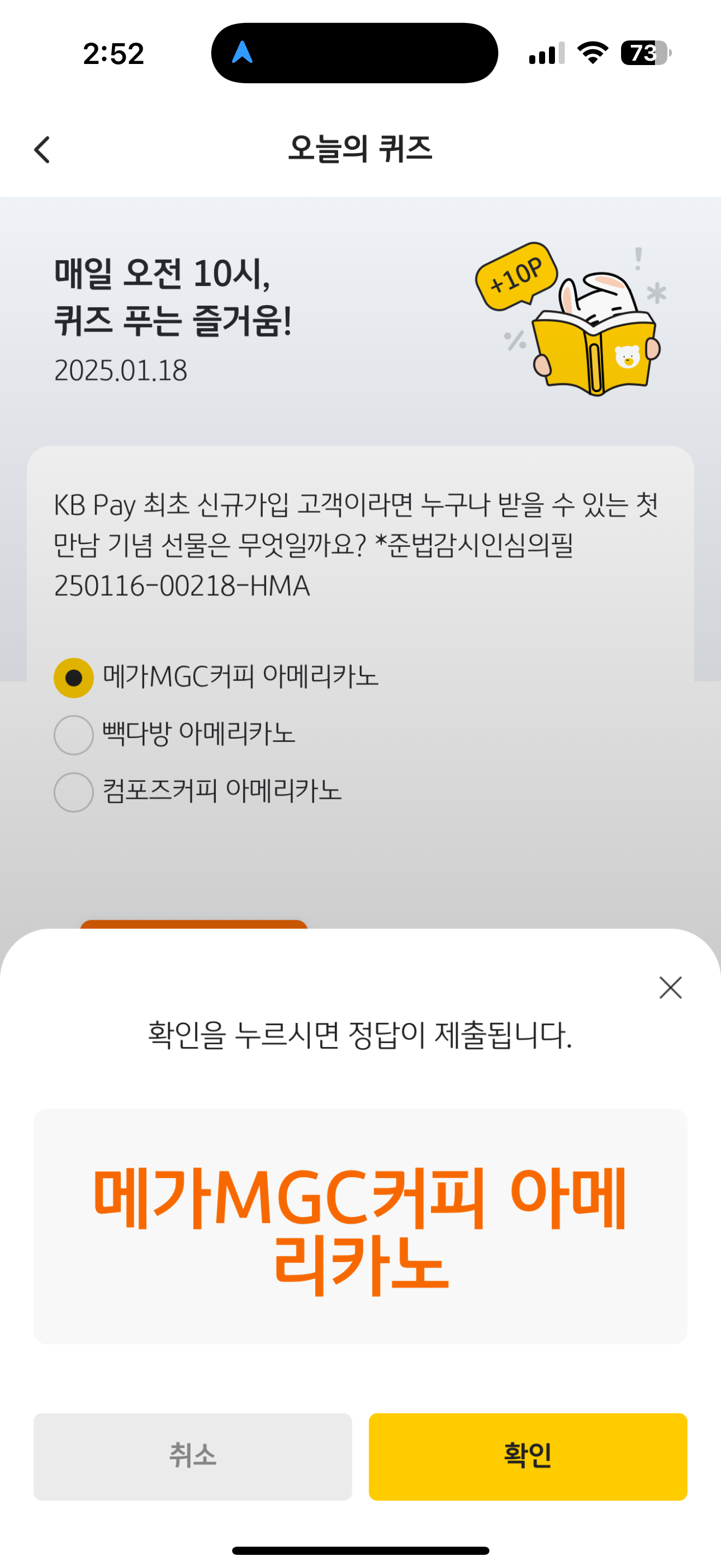 KB Pay 오늘의 퀴즈 정답은 메가MGC커피 아메리카노 입니다
