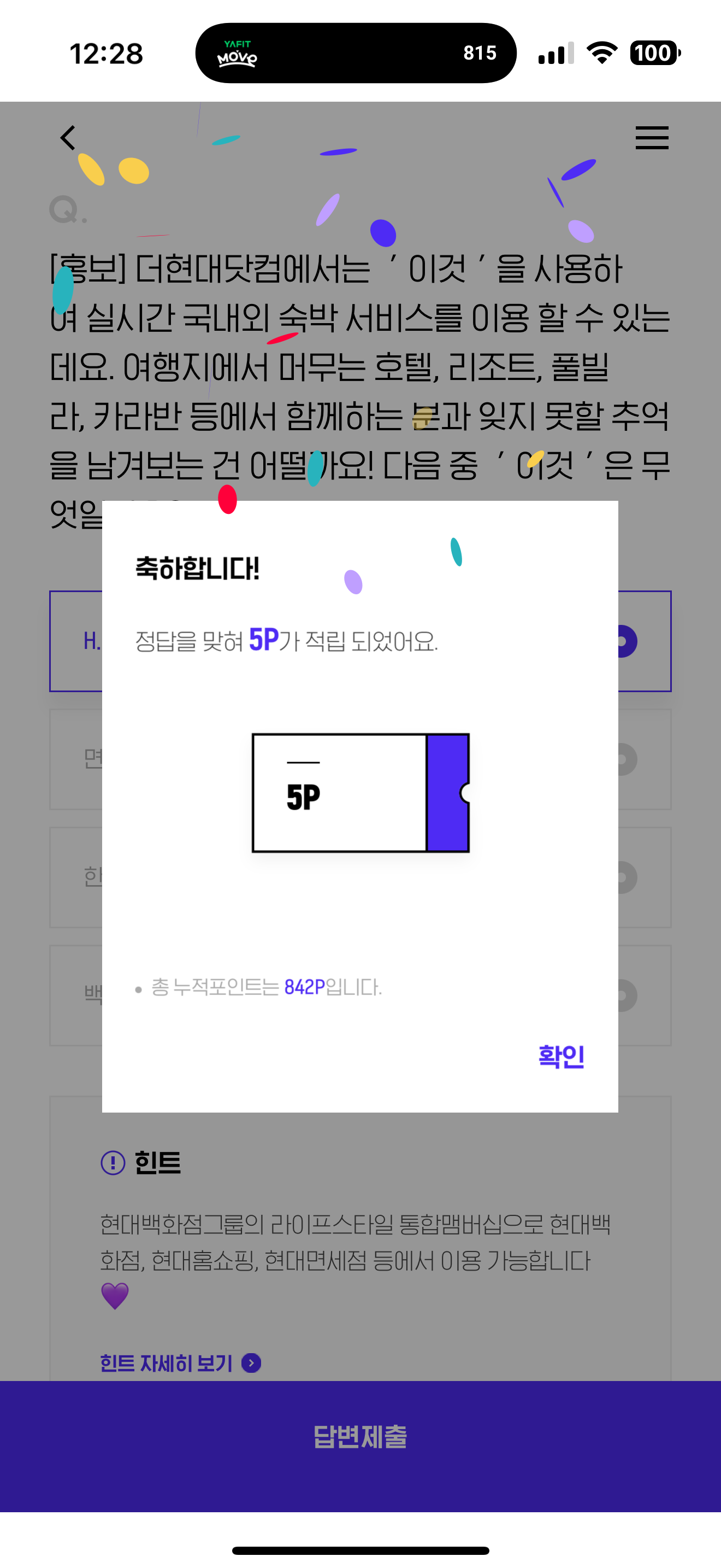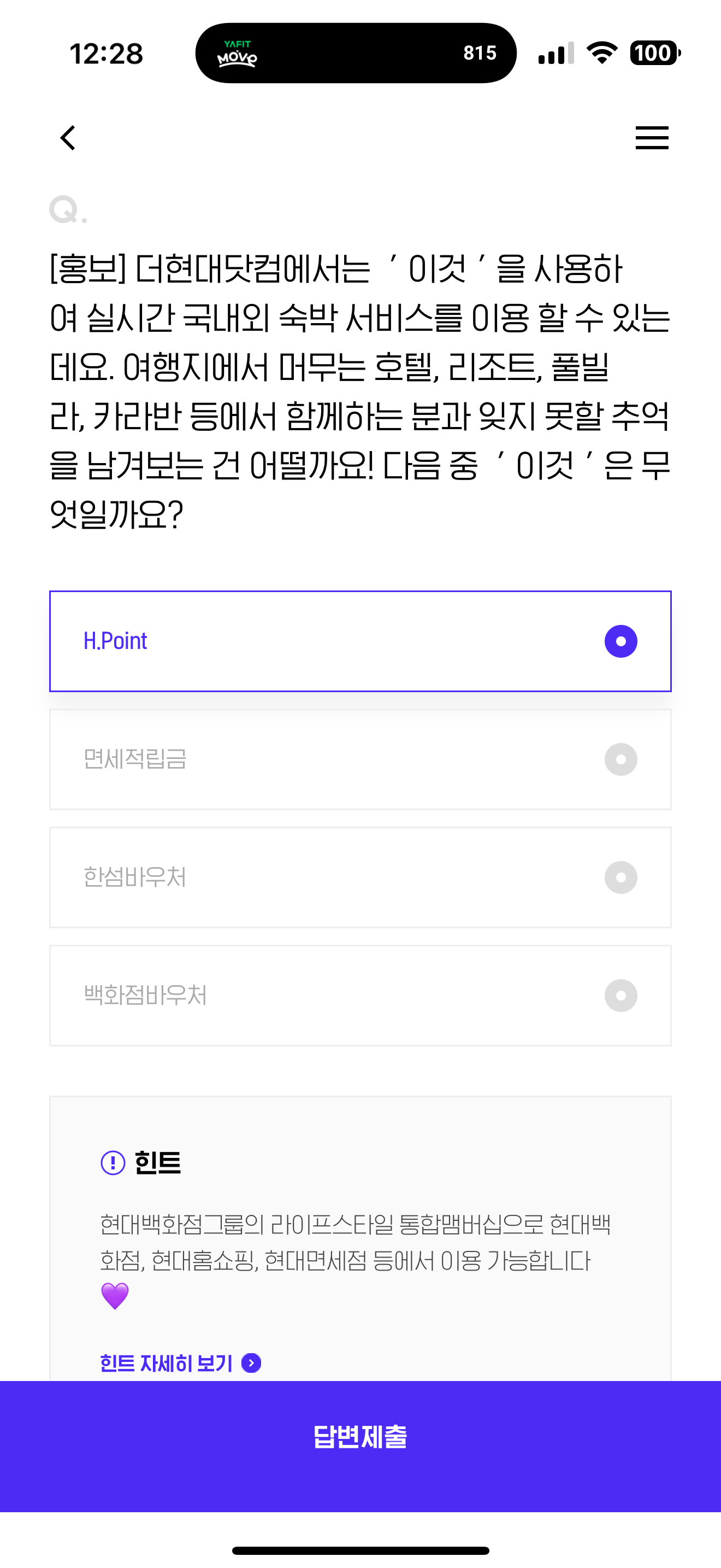 더현대닷컴에서는 ' 이것 ' 을 사용하여 실시간 국내외 숙박 서비스를 이용 할 수 있는데요. 여행지에서 머무는 호텔, 리조트, 풀빌라, 카라반 등에서 함께하는 분과 잊지 못할 추억을 남겨보는 건 어떨까요! 다음 중 ' 이것 ' 은 무엇일까요? 보기는 1. H.Point 2. 면세적립금 3. 한섬바우처 4. 백화점바우처 입니다