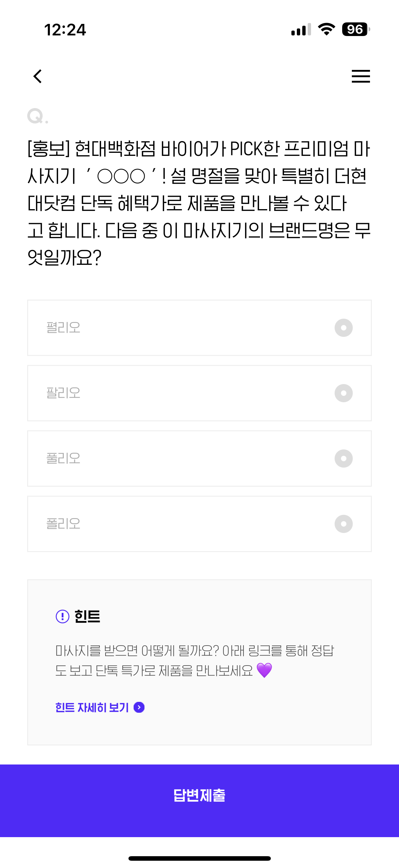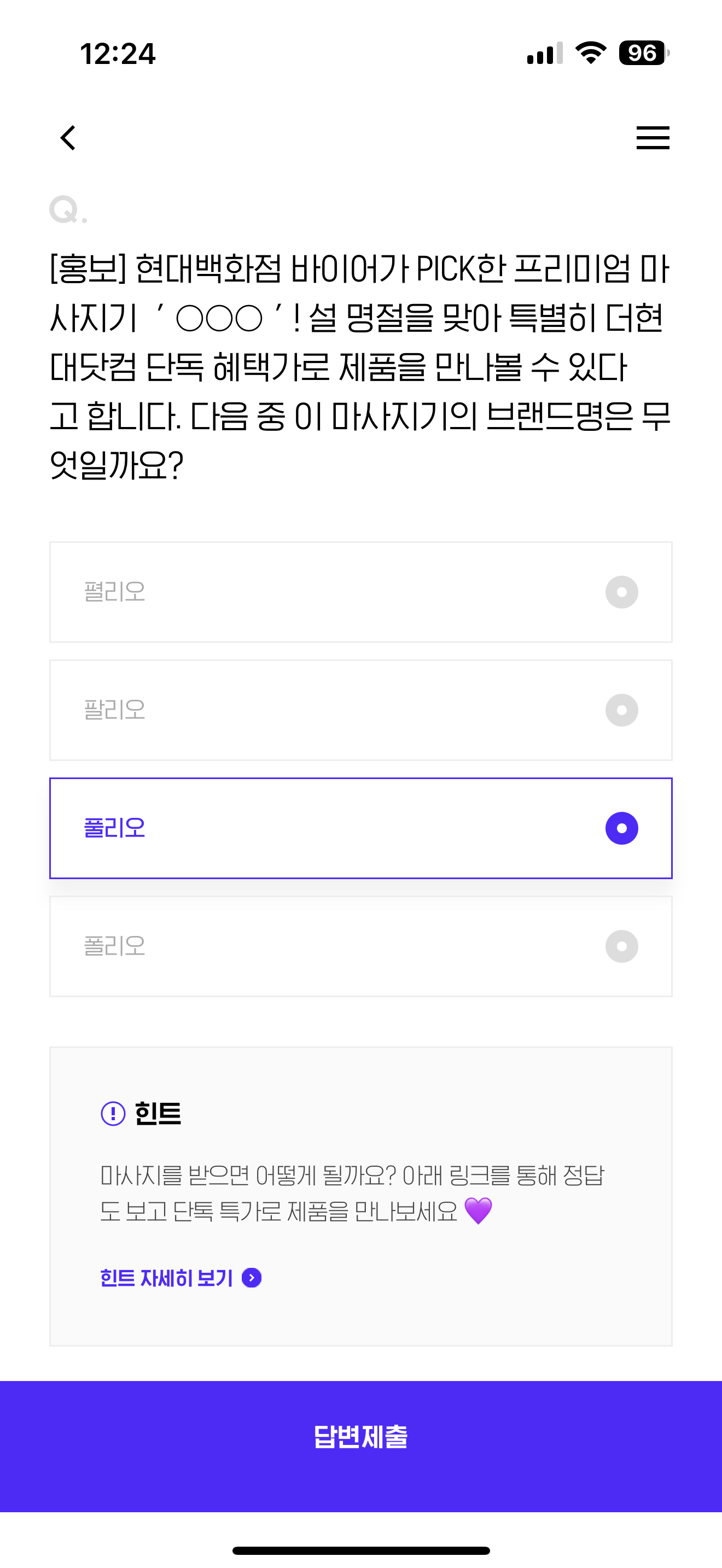 현대백화점 바이어가 PICK한 프리미엄 마사지기 ' OOO ' ! 설 명절을 맞아 특별히 더현대닷컴 단독 혜택가로 제품을 만나볼 수 있다고 합니다. 다음 중 이 마사지기의 브랜드명은 무엇일까요? 보기는 1. 펼리오 2. 팔리오 3. 풀리오 4. 폴리오 입니다. 마사지를 하면 풀린다는 의미를 담고 있습니다.