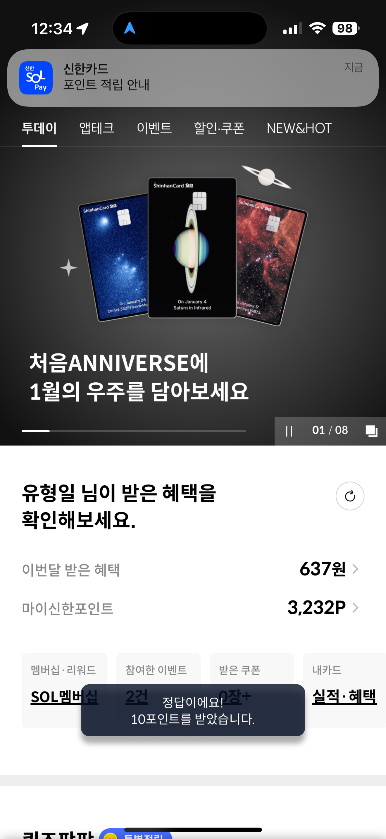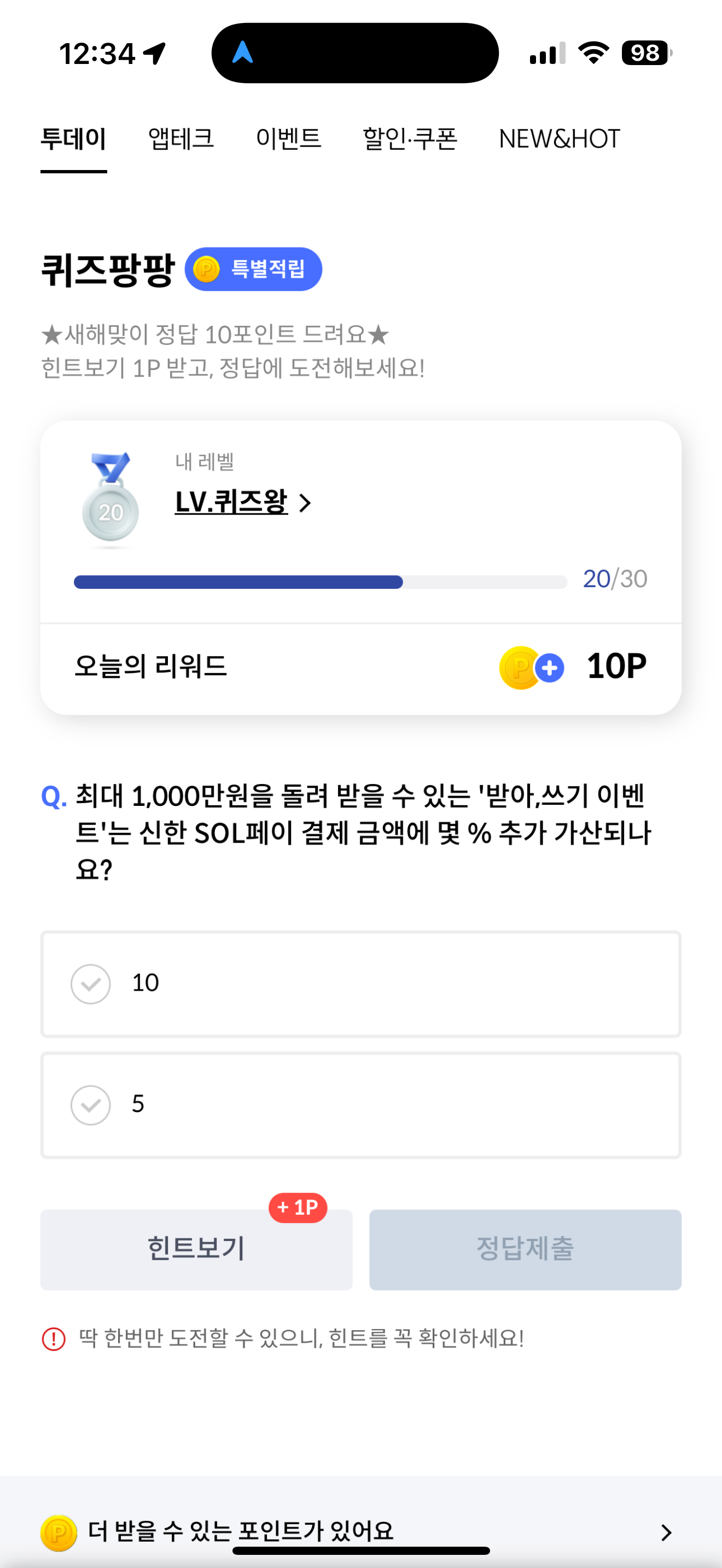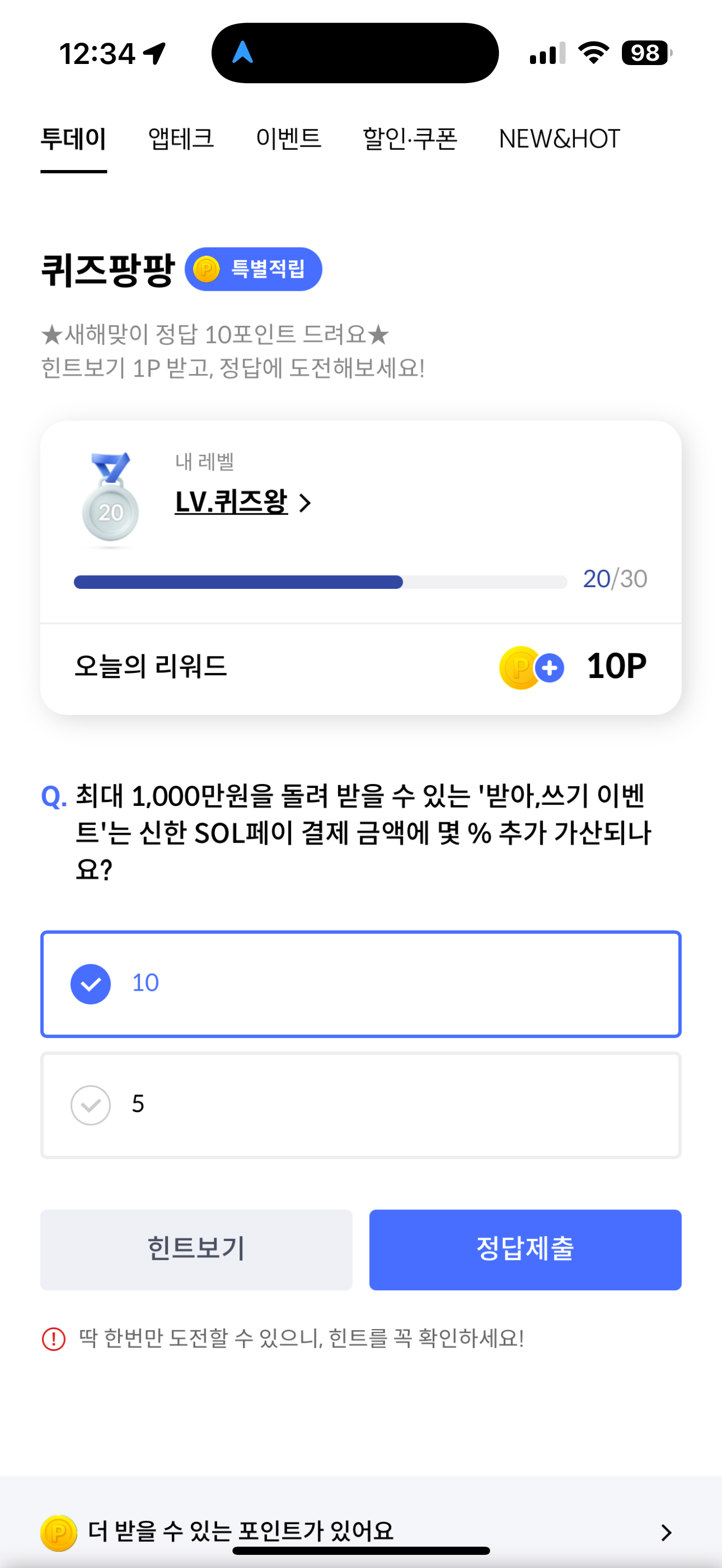 신한카드 퀴즈팡팡 정답은 10 입니다