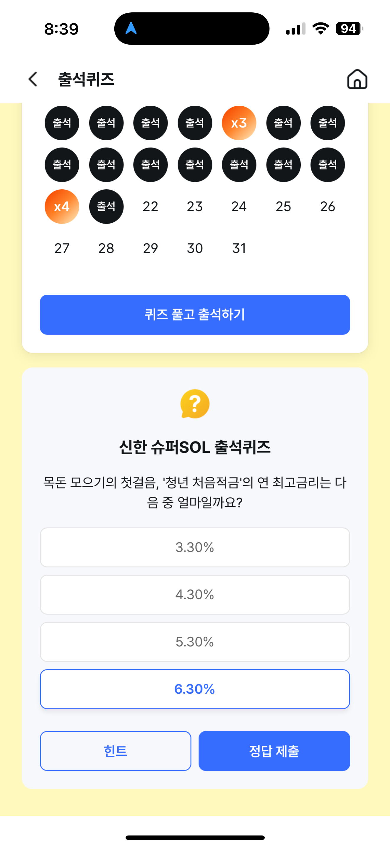 신한 슈퍼SOL 출석퀴즈 정답은 4번입니다. 원래는 5.30% 이지만 보기의 정답은 4번이니 주의하세요