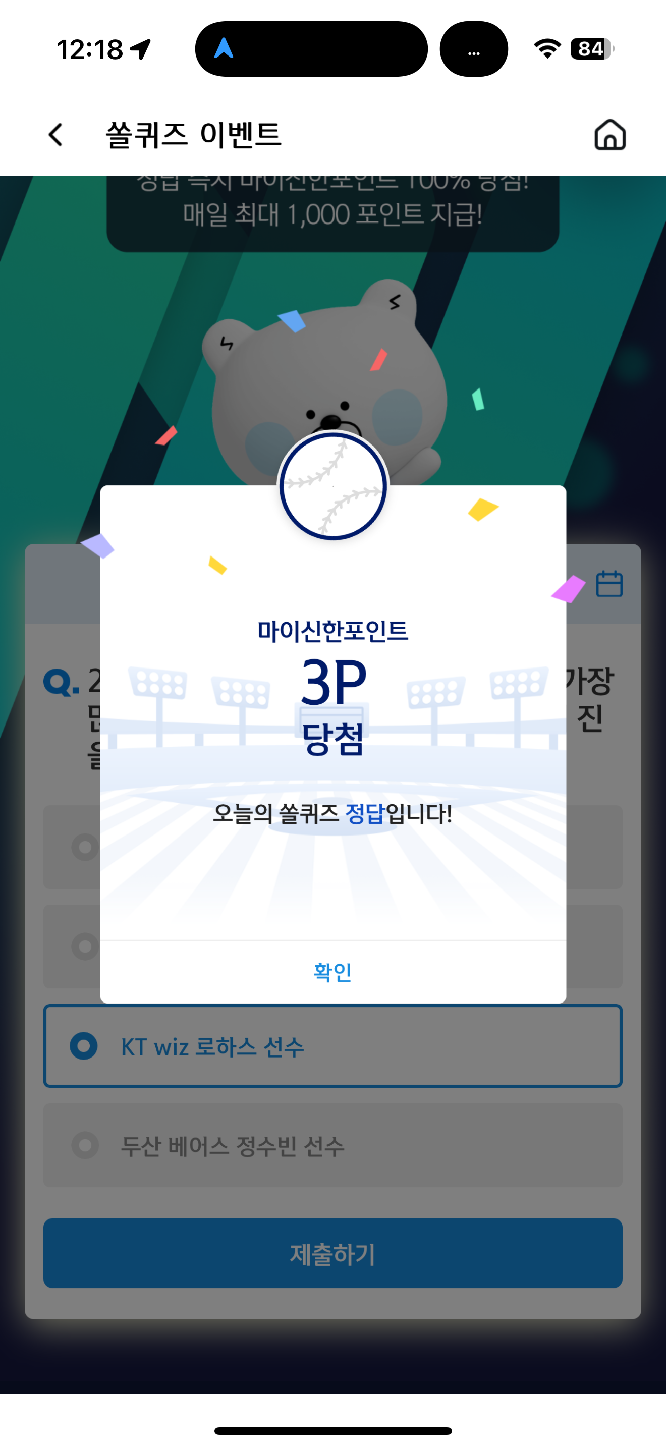 신한 슈퍼SOL 야구/상식 쏠퀴즈 정답은 KT wiz 로하스 선수 입니다