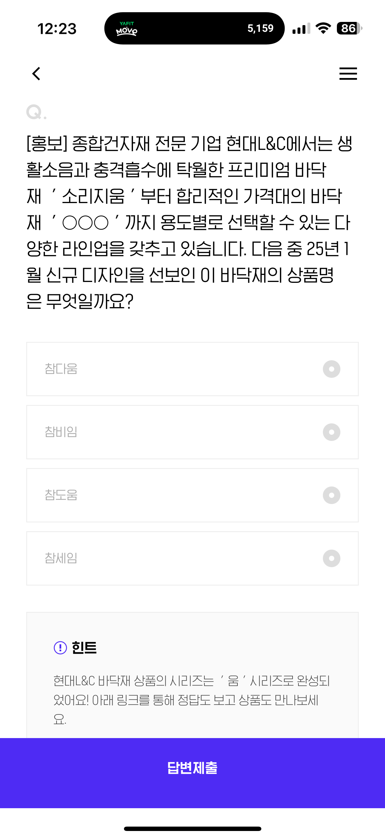 종합건자재 전문 기업 현대L&C에서는 생활소음 충격흡수에 탁월한 프리미엄 바닥재 ' 소리지움 ' 부터 합리적인 가격대의 바닥재 'OOO ' 까지 용도별로 선택할 수 있는 다양한 라인업을 갖추고 있습니다. 다음 중 25년 1월 신규 디자인을 선보인 이 바닥재의 상품명은 무엇일까요? 보기는 1. 참다움 2. 참비임 3. 참도움 4. 참세임