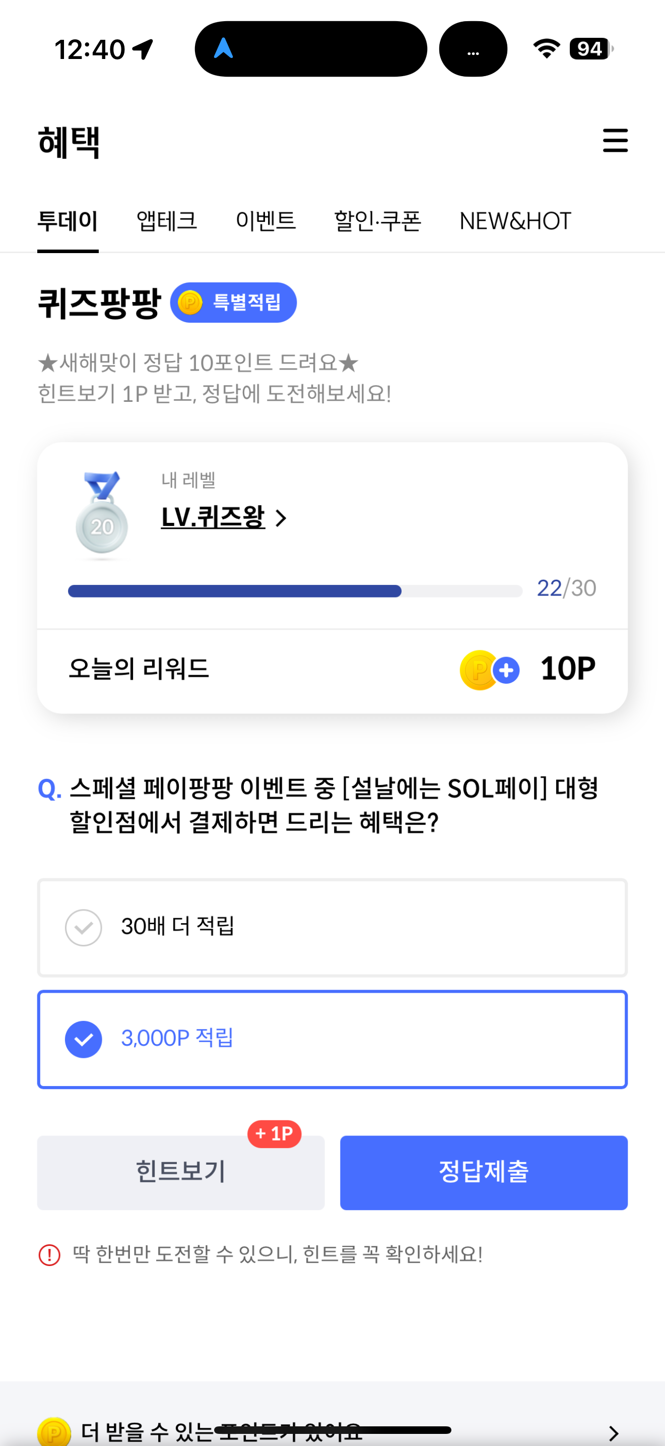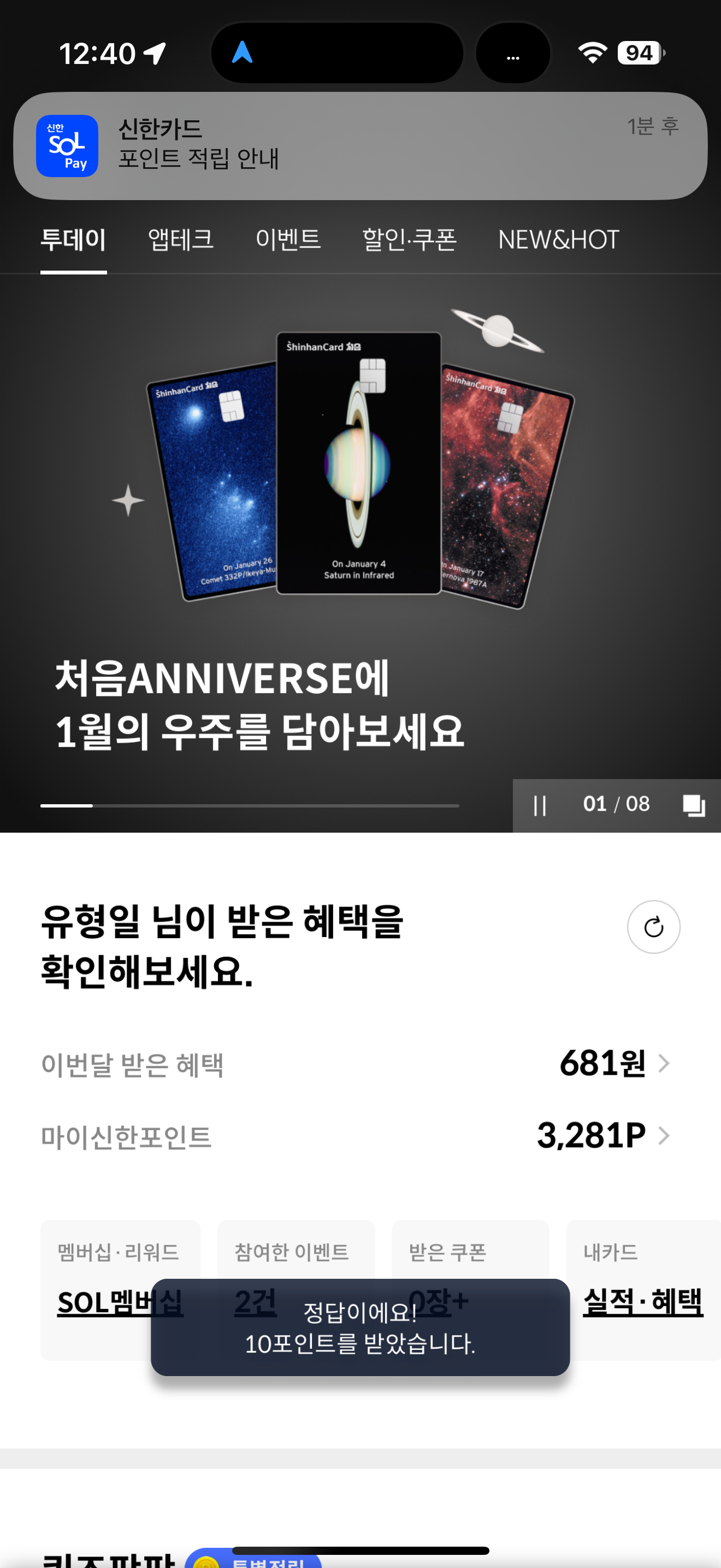 신한카드 퀴즈팡팡 정답은 3,000P 적립 입니다