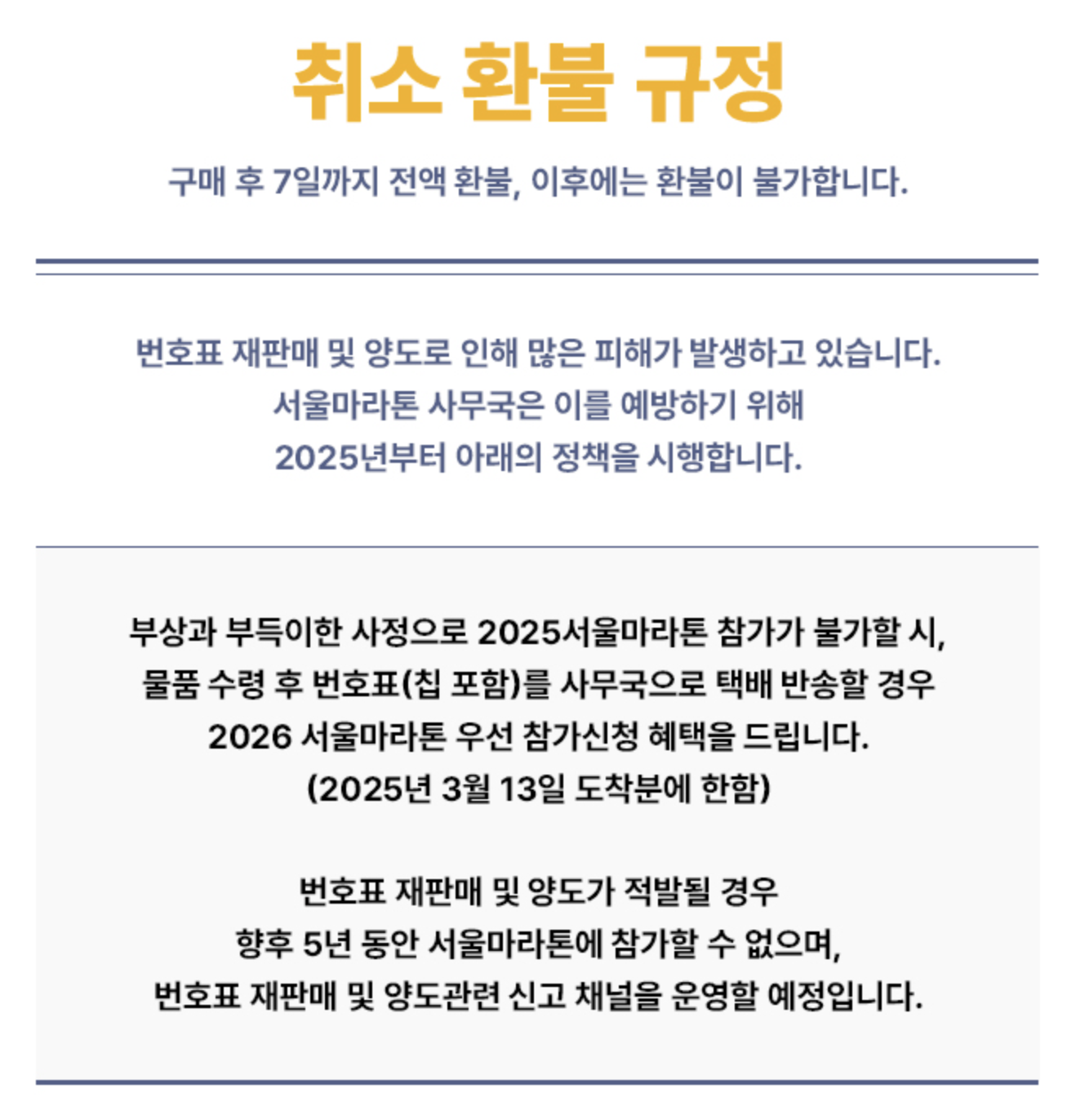 2025 서울마라톤 추가 접수는 구매 후 7일까지 전액 환불이 가능합니다. 그리고 부득이한 사정으로 2025 서울마라톤 참가가 불가능하면 2026 서울마라톤 우선 참가신청 혜택을 제공합니다. 혹시나 못달릴 거 같으면 내년을 위해 이런 부분도 체크를 해보시면 좋을 것 같습니다.