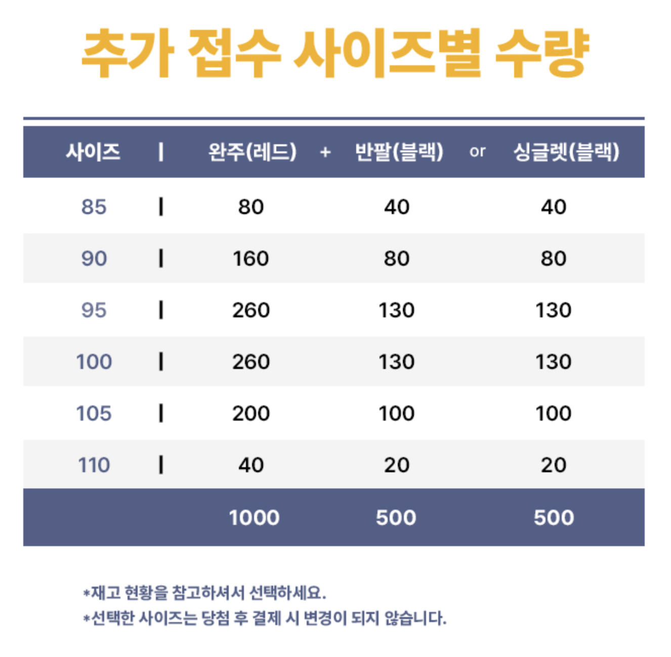 그리고 2025 서울마라톤 추가 접수는 옷 사이즈 재고 수량에 따라 접수를 받습니다. 85사이즈는 80명, 90사이즌 160명 95사이즈는 260명, 100사이즈는 260명, 105 사이즈 200명, 110사이즈 40명 입니다. 그래서 총 1000명 입니다. 옷사이즈에 따라 전략을 달리하면 어느정도 승산이 있을 수도 있을 것 같습니다.