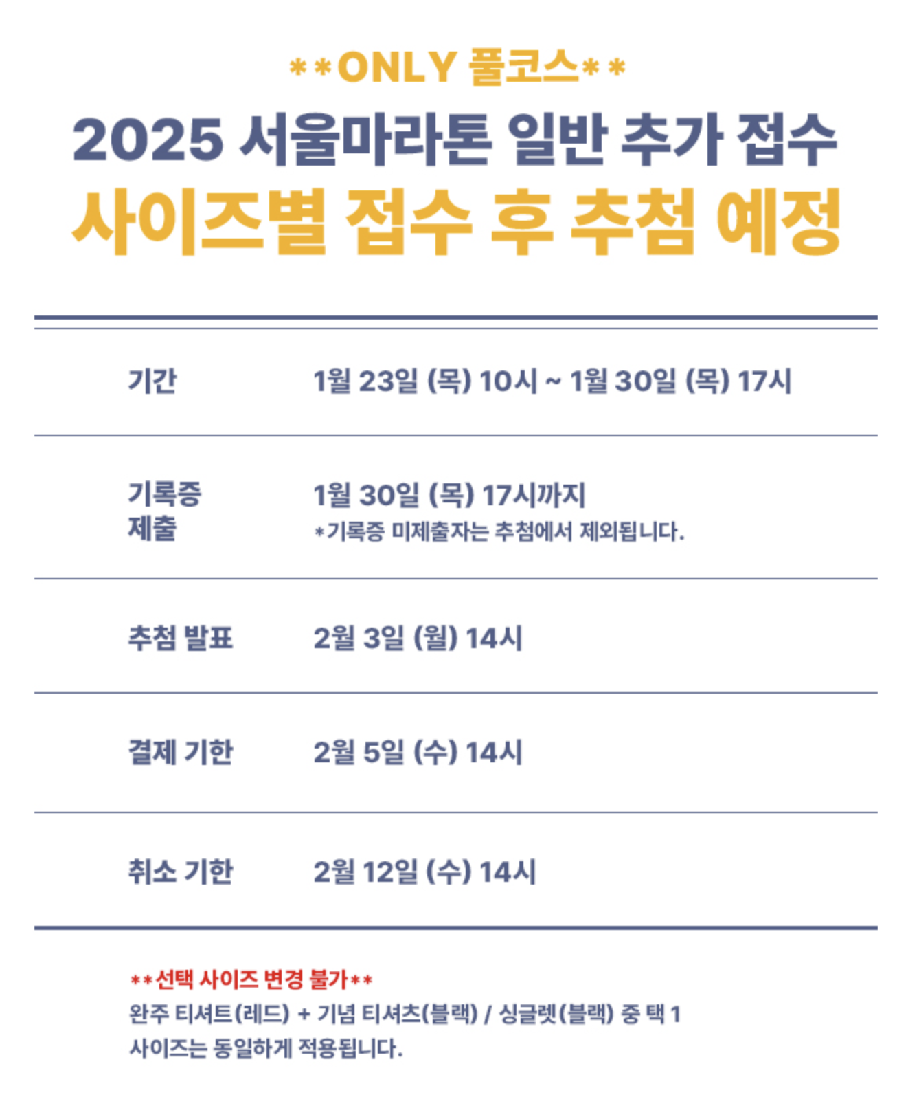 2025 서울마라톤 추가 접수는 1월 23일 (목) 10시~1월 30일(목) 17시까지 받습니다. 이번엔 처음으로 추첨 발표를 진행합니다. 그러니 기간내에만 접수를 하면 됩니다. 그리고 독특하게 기록증 제출을 기한 내에 하셔야 합니다.