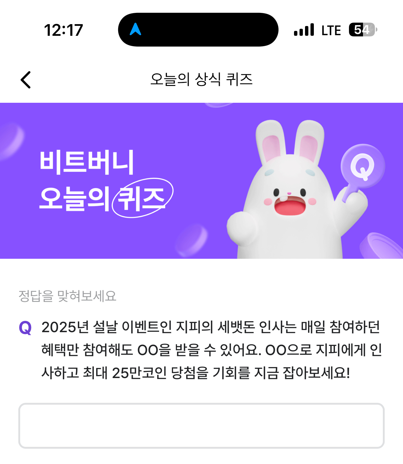 2025년 설날 이벤트인 지피의 세뱃돈 인사는 매일 참여하던 혜택만 참여해도 OO을 받을 수 있어요. OO으로 지피에게 인사하고 최대 25만코인 당첨을 기회를 지금 잡아보세요! 주관식 퀴즈인데요. 25만 코인이 걸려 있는 파격적인 이벤트이니 잘 참고해서 도전해 보세요