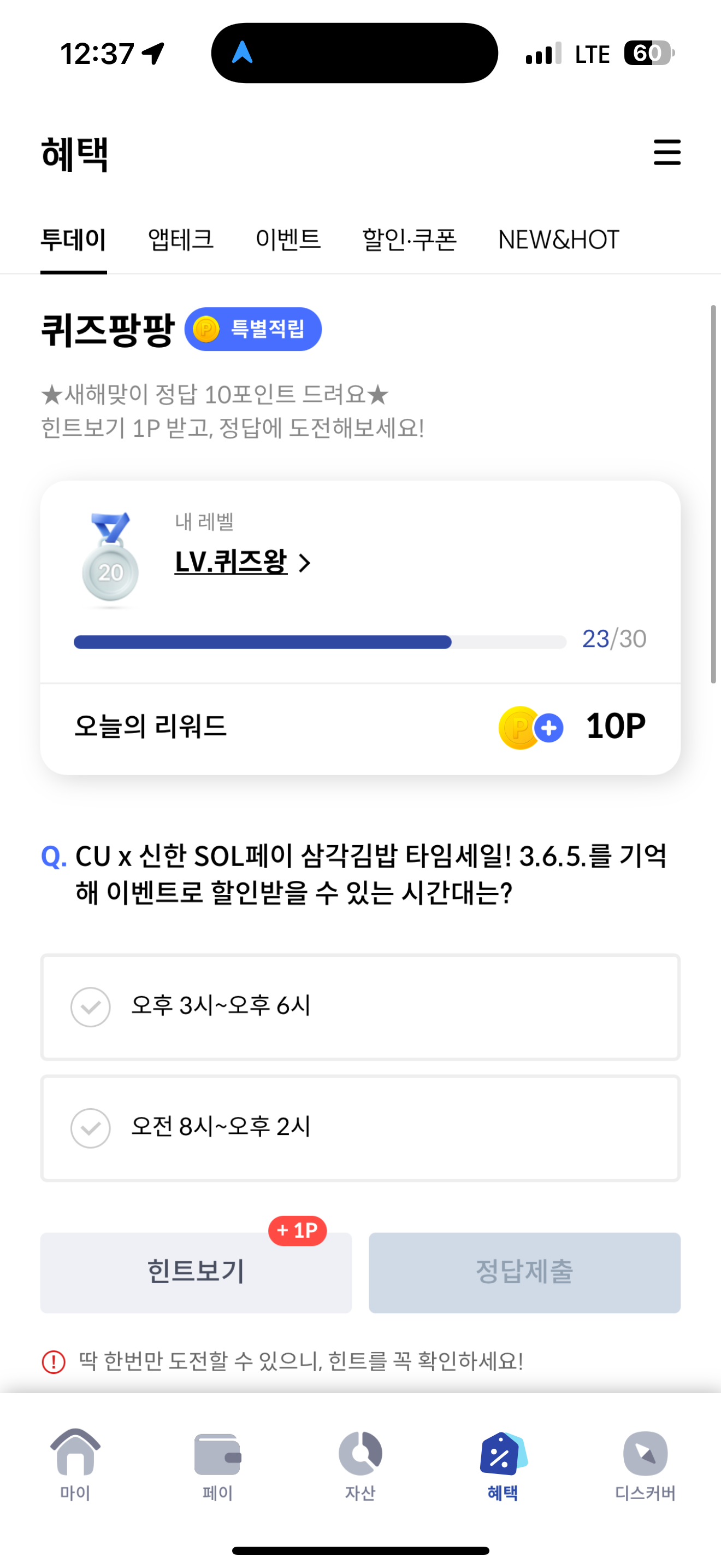 신한카드 퀴즈팡팡 정답은 오전 8시~오후 2시 입니다