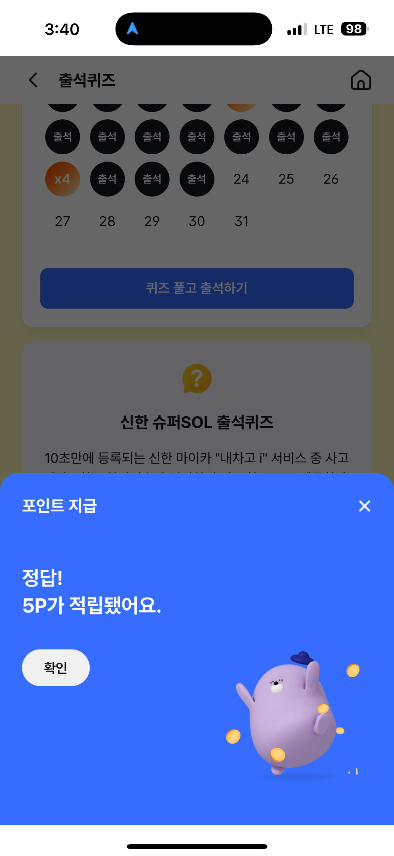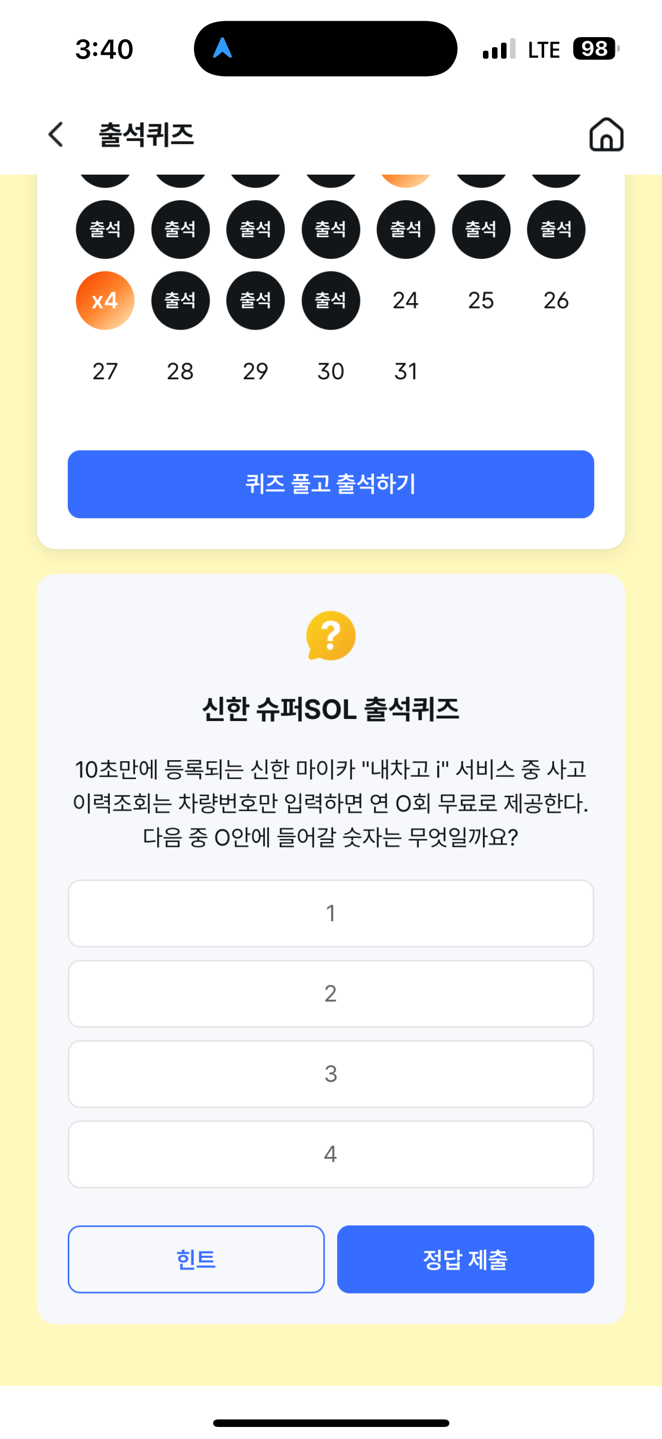 신한 슈퍼SOL 출석퀴즈 정답은 3 입니다