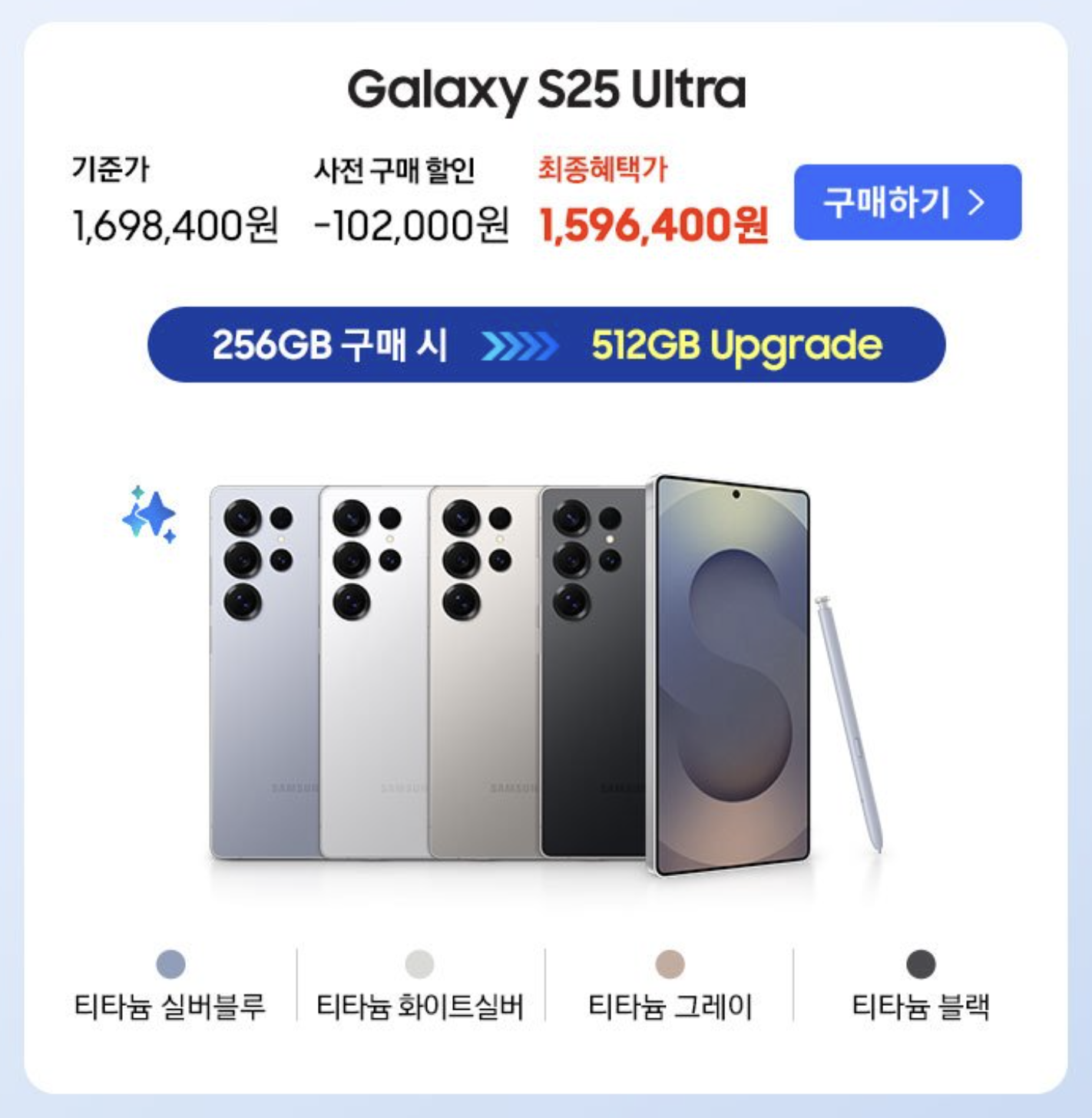 갤럭시S25 울트라 사전예약 혜택은 102,000원 가격 할인을 받아 1,596,400원에 구입 가능하고 마찬가지로 512GB로 용량 업그레이드 혜택이 주어집니다.