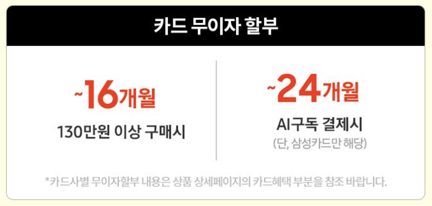 그리고 카드 무이자 할부도 진행합니다. 130만원 이상은 최대 16개월, AI 구독 결제시는 최대 24개월까지 카드 무이자 할부를 할 수 있습니다. 요즘은 통신사 약정 보다 카드 할부를 이용해 부담을 줄이고 알뜰폰 요금제를 조합하는게 인기입니다.
