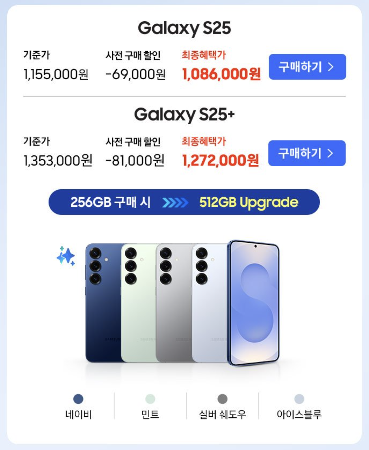 삼성 갤럭시S25 사전예약 혜택은 69,000원 가격 할인을 받아 1,086,000원에 구입 가능하고 갤럭시S25 플러스(갤럭시S25+)는 81,000원 가격 할인을 받아 1,272,000원에 구입 가능합니다.