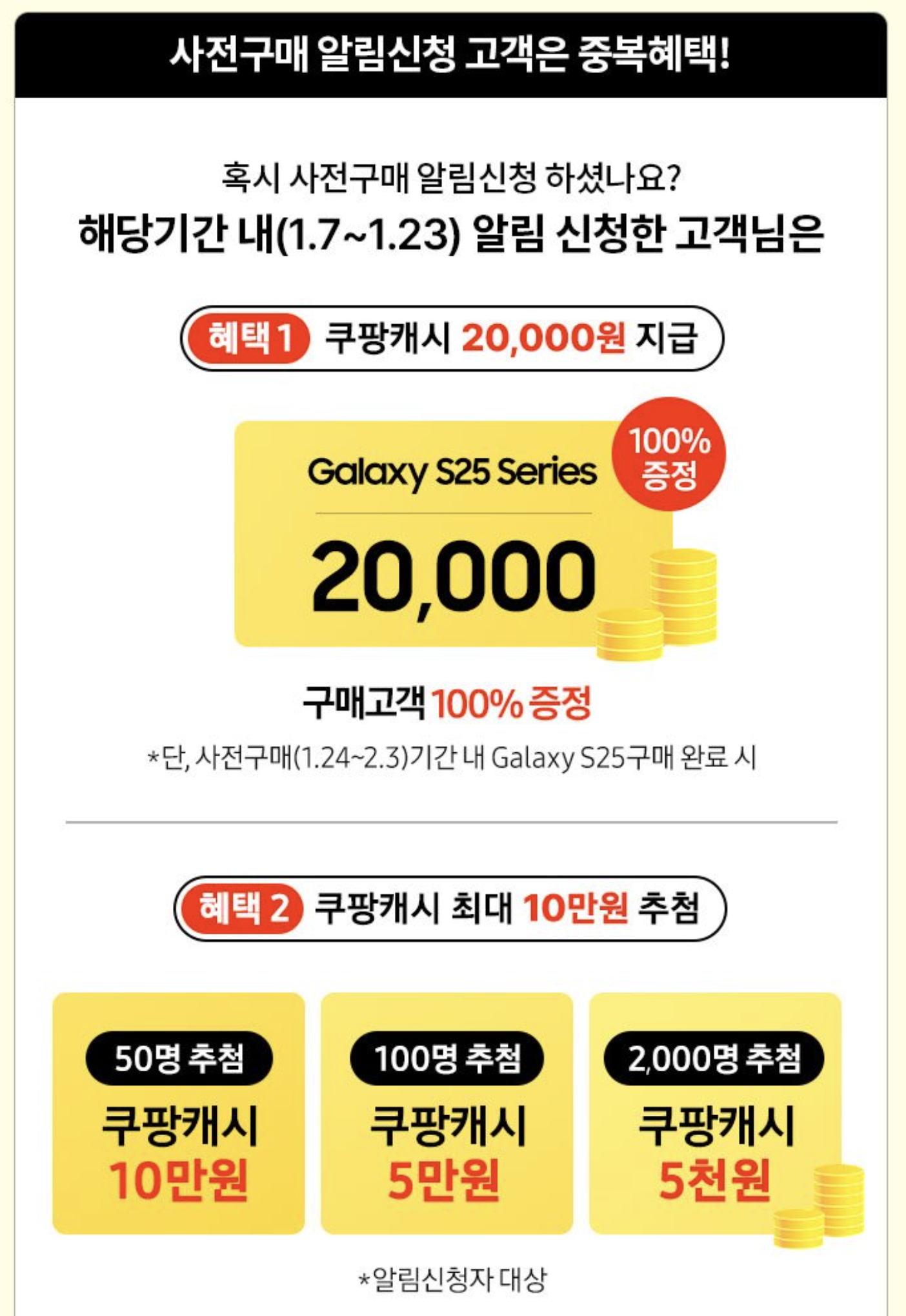 그리고 쿠팡 갤럭시S25 사전 구매 알림 신청을 한 분들은 쿠팡 캐시 2만원을 받을 수 있고 추첨을 통해 추가 혜택도 받을 수 있습니다.