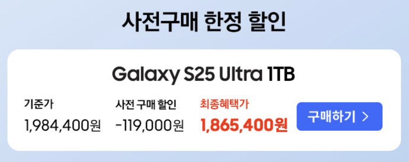 그리고 갤럭시S25 울트라 1TB 모델도 사전 구매 한정 할인을 받을 수 있습니다. 119,000원 가격 할인을 받아 1,865,400원에 구입 가능합니다. 영상을 스마트폰으로 많이 찍는 분이라면 1TB가 정말 좋습니다.