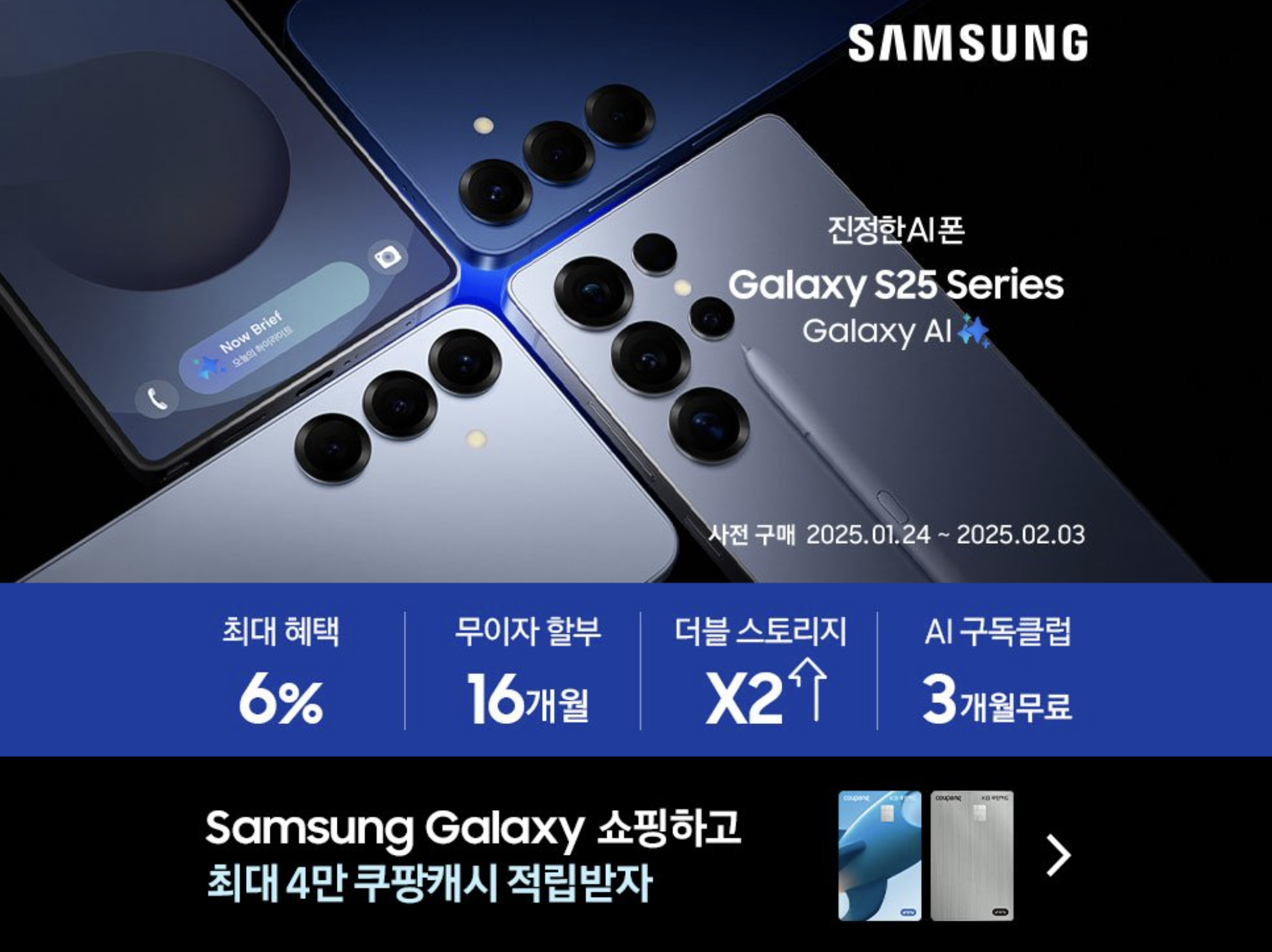 삼성 갤럭시S25 시리즈 사전예약 혜택은 최대 6% 활인 혜택, 무이자 할부 16개월, 더블 스토리지, AI 구독클럽 3개월 무료 혜택이 있습니다.