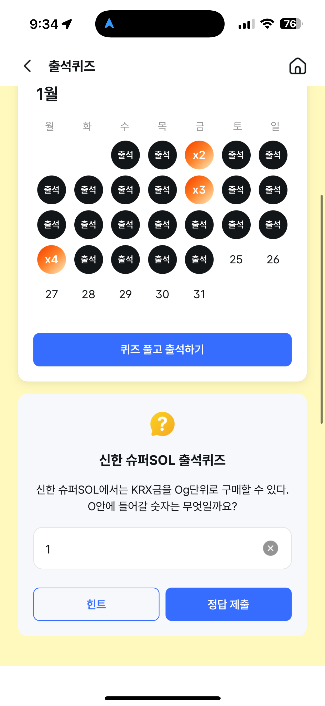 신한 슈퍼SOL 출석퀴즈 정답은 1 입니다