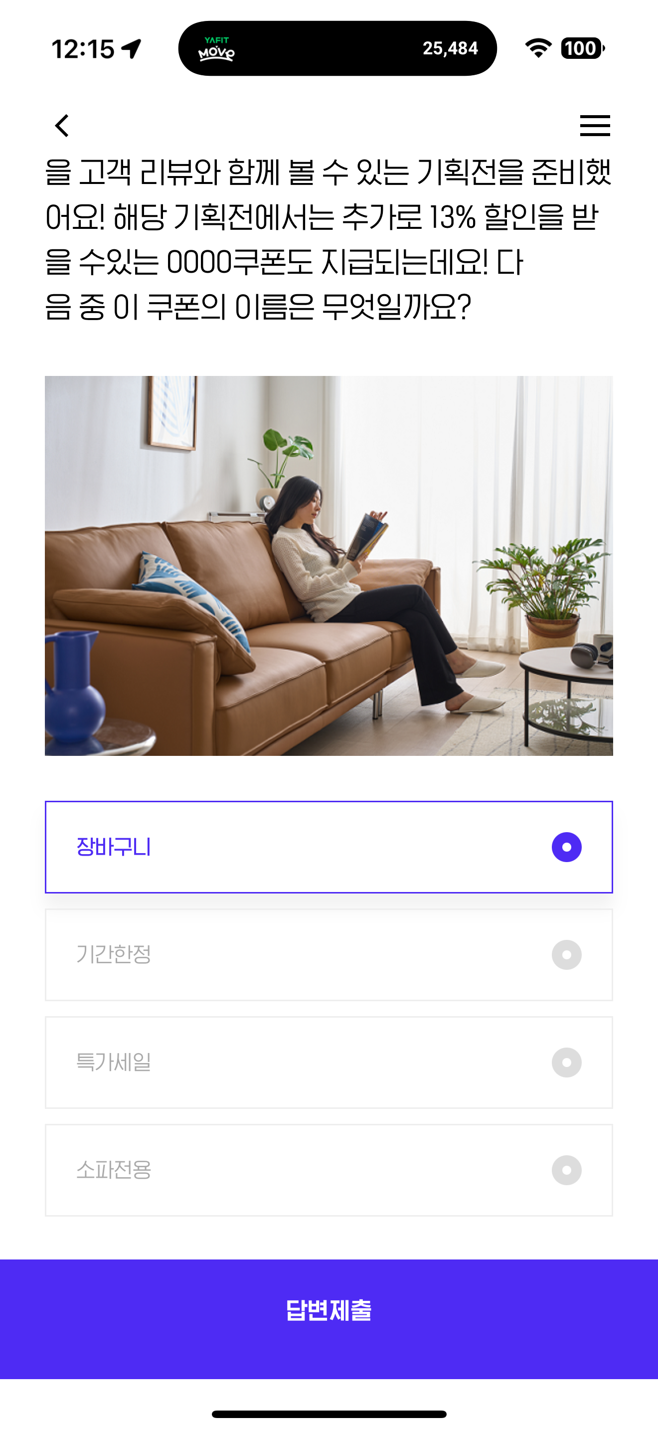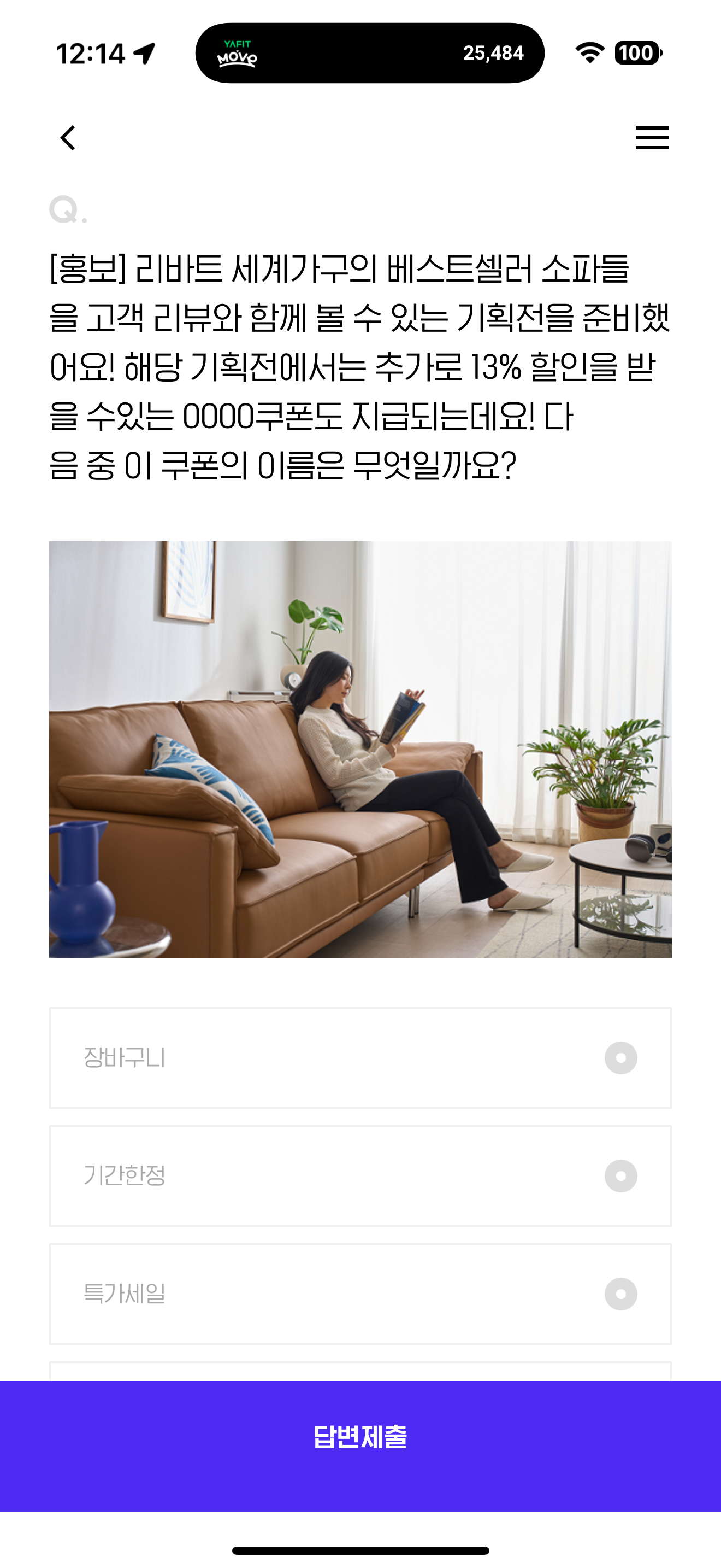 리바트 세계가구의 베스트셀러 소파들을 고객 리뷰와 함께 볼 수 있는 기획전을 준비했어요! 해당 기획전에서는 추가로 13% 할인을 받을 수있는 OOOOO쿠폰도 지급되는데요! 다음 중 이 쿠폰의 이름은 무엇일까요? 보기는 1. 장바구니 2. 기간한정 3. 특가세일 4. 소파전용 입니다