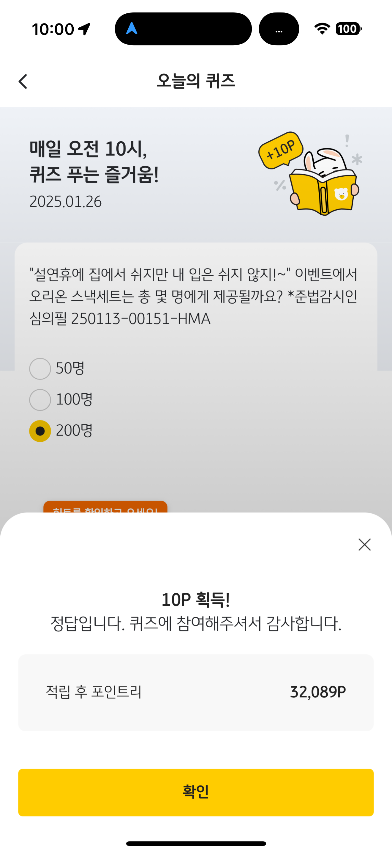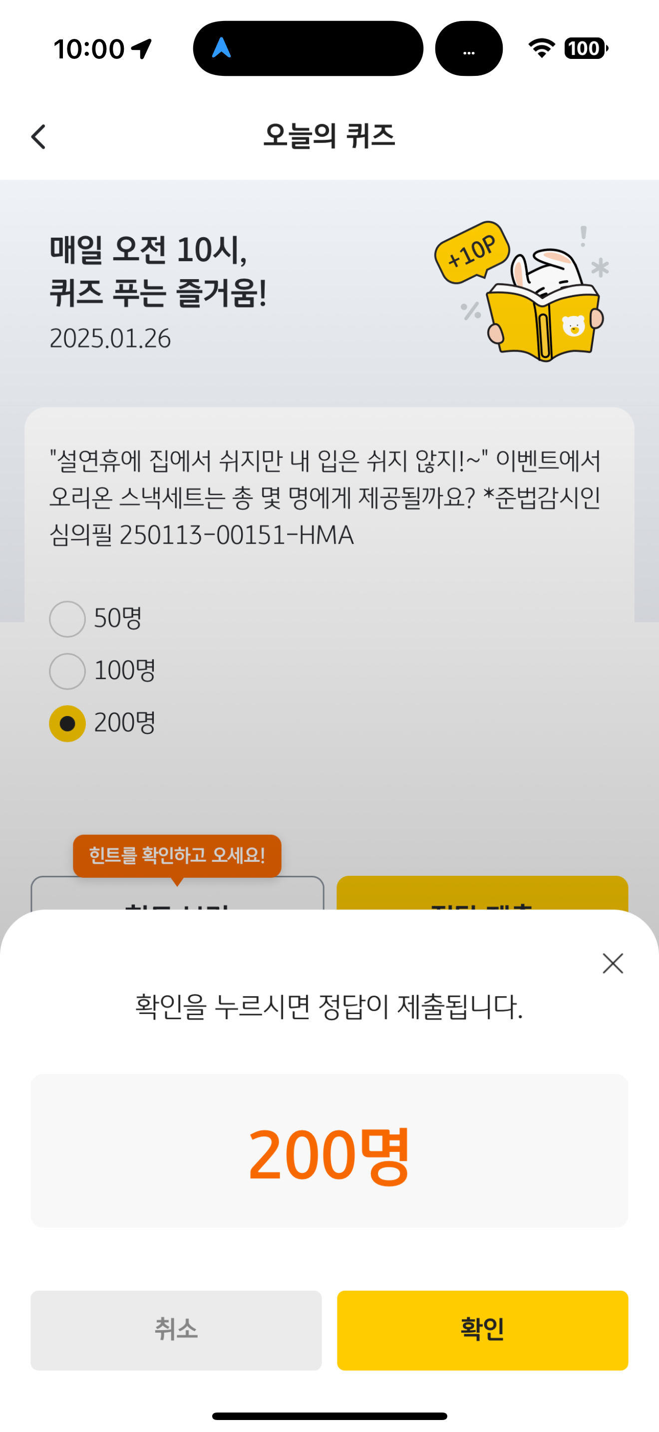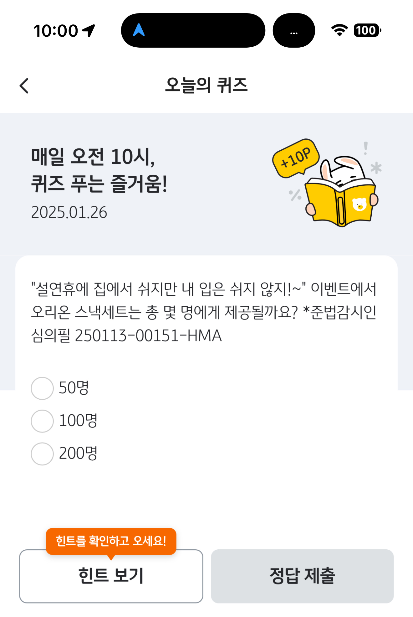"설연휴에 집에서 쉬지만 내 입은 쉬지 않지!~" 이벤트에서 오리온 스낵세트는 총 몇 명에게 제공될까요? *준법감시인심의필 250113-00151-HMA 보기는 1. 50명 2. 100명 3. 200명 입니다. 설연휴 이벤트로 푸짐한 경품이 걸렸습니다. 참고해서 도전해 보세요