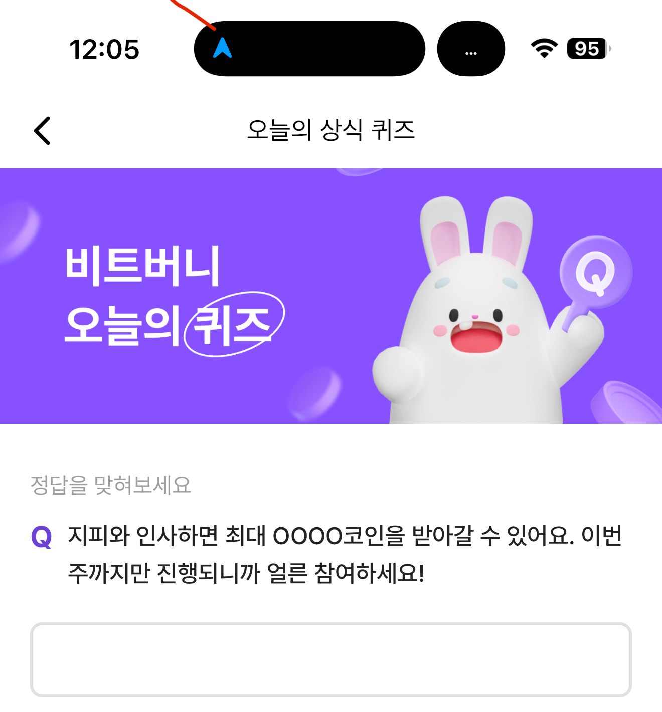지피와 인사하면 최대 OOOO코인을 받아갈 수 있어요. 이번주까지만 진행되니까 얼른 참여하세요! 주관식 퀴즈인데요. 설날을 맞아 지피와 인사하면 코인을 주는 이벤트가 열리고 있습니다. 정말 파격적인 코인 혜택을 주니 잘 참고해서 도전하세요