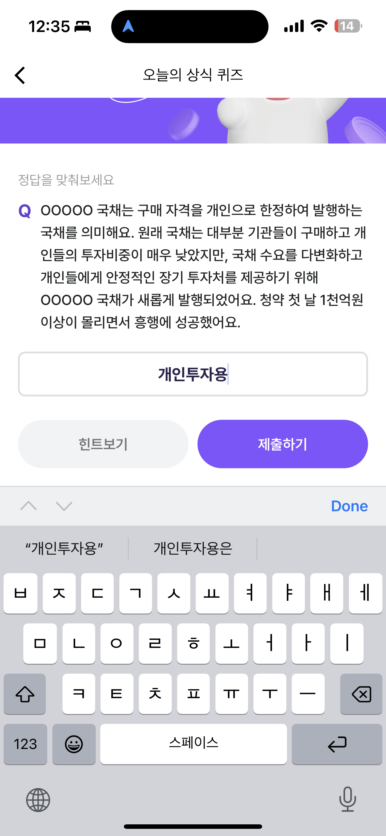 OOOOO 국채는 구매 자격을 개인으로 한정하여 발행하는 국채를 의미해요. 원래 국채는 대부분 기관들이 구매하고 개인들의 투자비중이 매우 낮았지만, 국채 수요를 다변화하고 개인들에게 안정적인 장기 투자처를 제공하기 위해 OOOOO 국채가 새롭게 발행되었어요. 청약 첫 날 1천억원 이상이 몰리면서 흥행에 성공했어요. 주관식 퀴즈인데요.