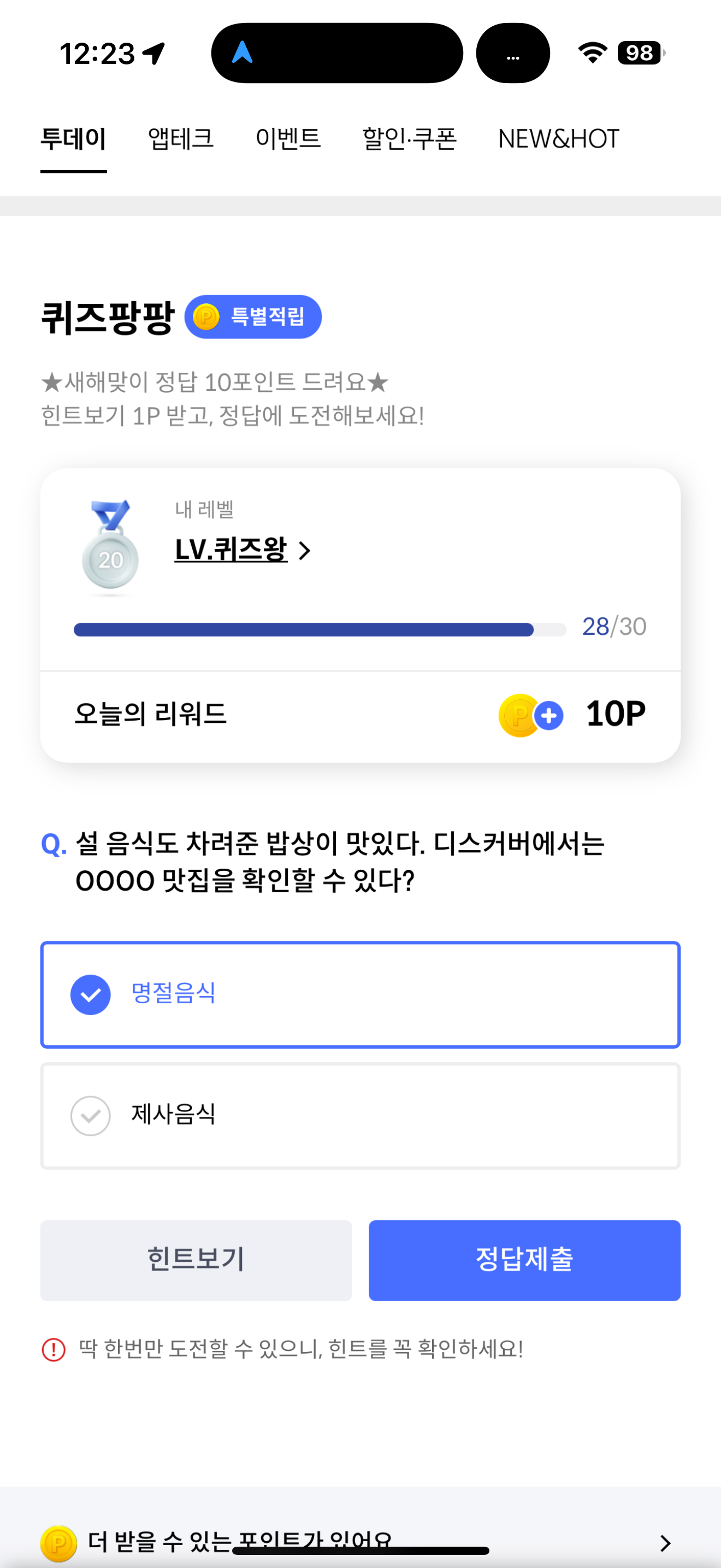 설 음식도 차려준 밥상이 맛있다. 디스커버에서는 OOOO 맛집을 확인할 수 있다? 보기는 1. 명절음식 2. 제사음식 입니다 설 음식을 생각하면 답이 보이죠. 설날을 맞아 너무나 쉽게 보기를 제시했습니다. 잘 참고해서 이용해 보세요