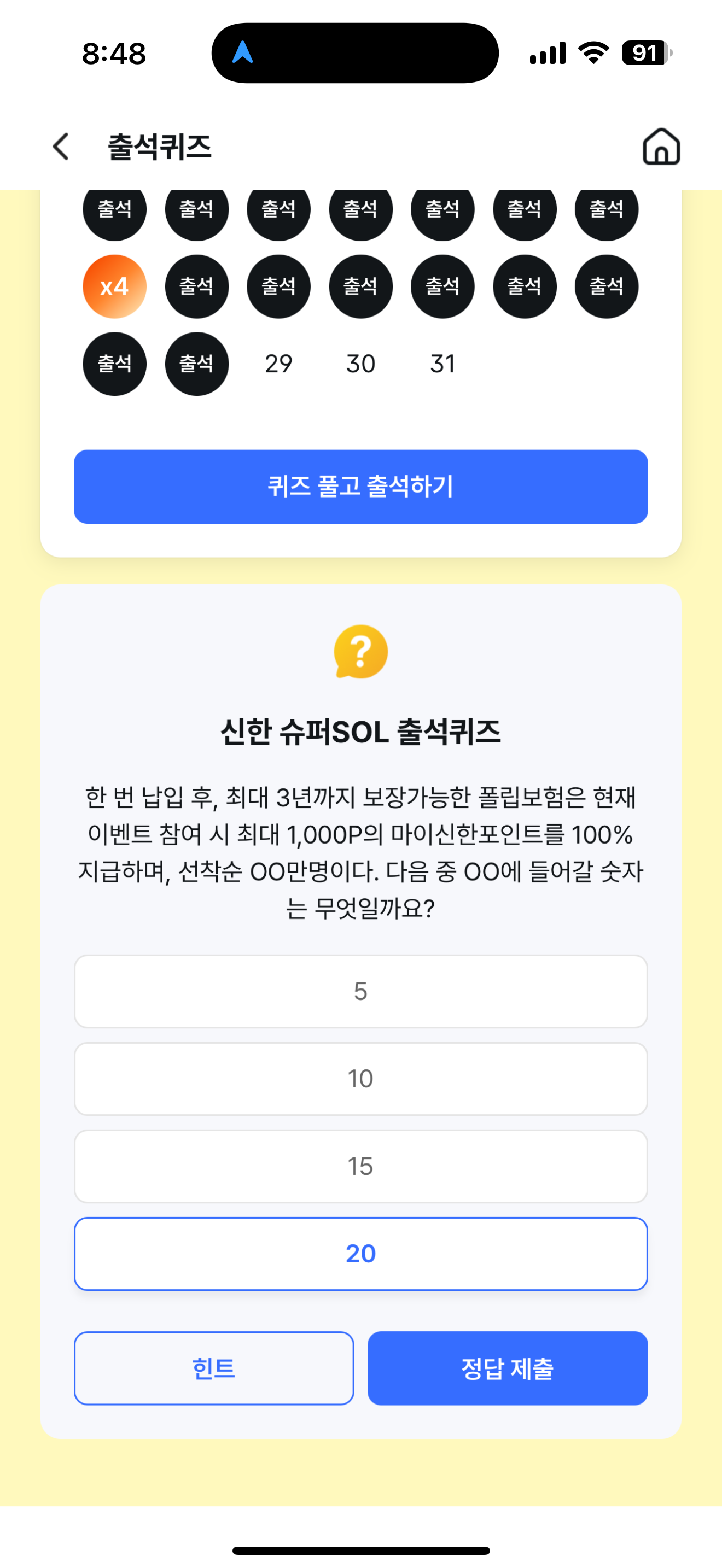 신한 슈퍼SOL 출석퀴즈 정답은 20 입니다