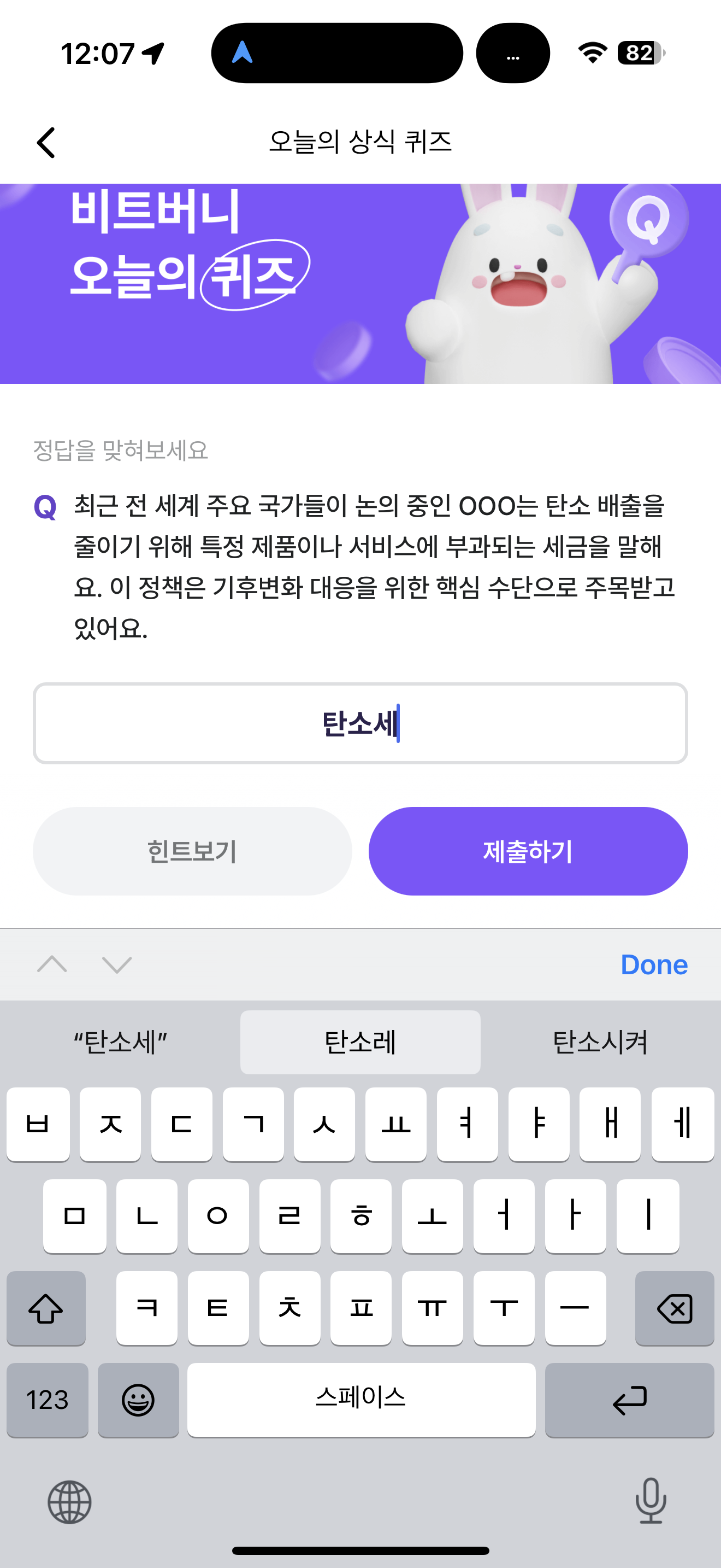 비트버니 오늘의 퀴즈 정답은 탄소세 입니다