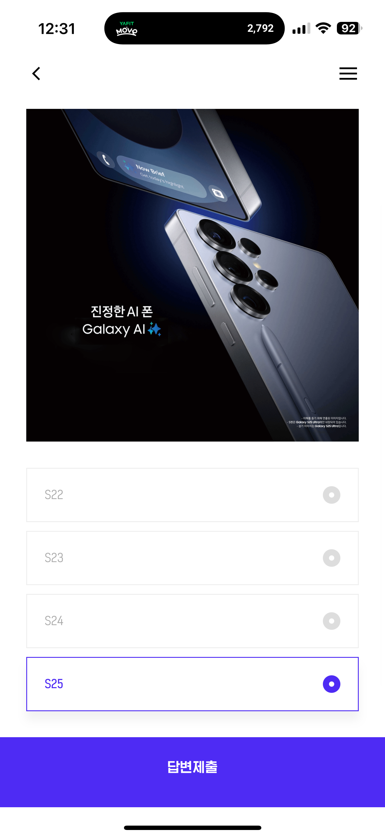 진정한 AI폰, 더블 스토리지 혜택까지 풍성한 사전예약으로 돌아온 <갤럭시OOO>시리즈 내일일 오전 11시 더현대라이브에서 최대 혜택으로 판매됩니다! 특히, 더현대 스페셜 프라이스에 방송 중 구매고객께는 추가 H.Pont까지 제공되는데요. 다음 중 <갤럭시OOO>는 무엇일까요? 보기는 1. S22 2. S23 3. S24 4. S25