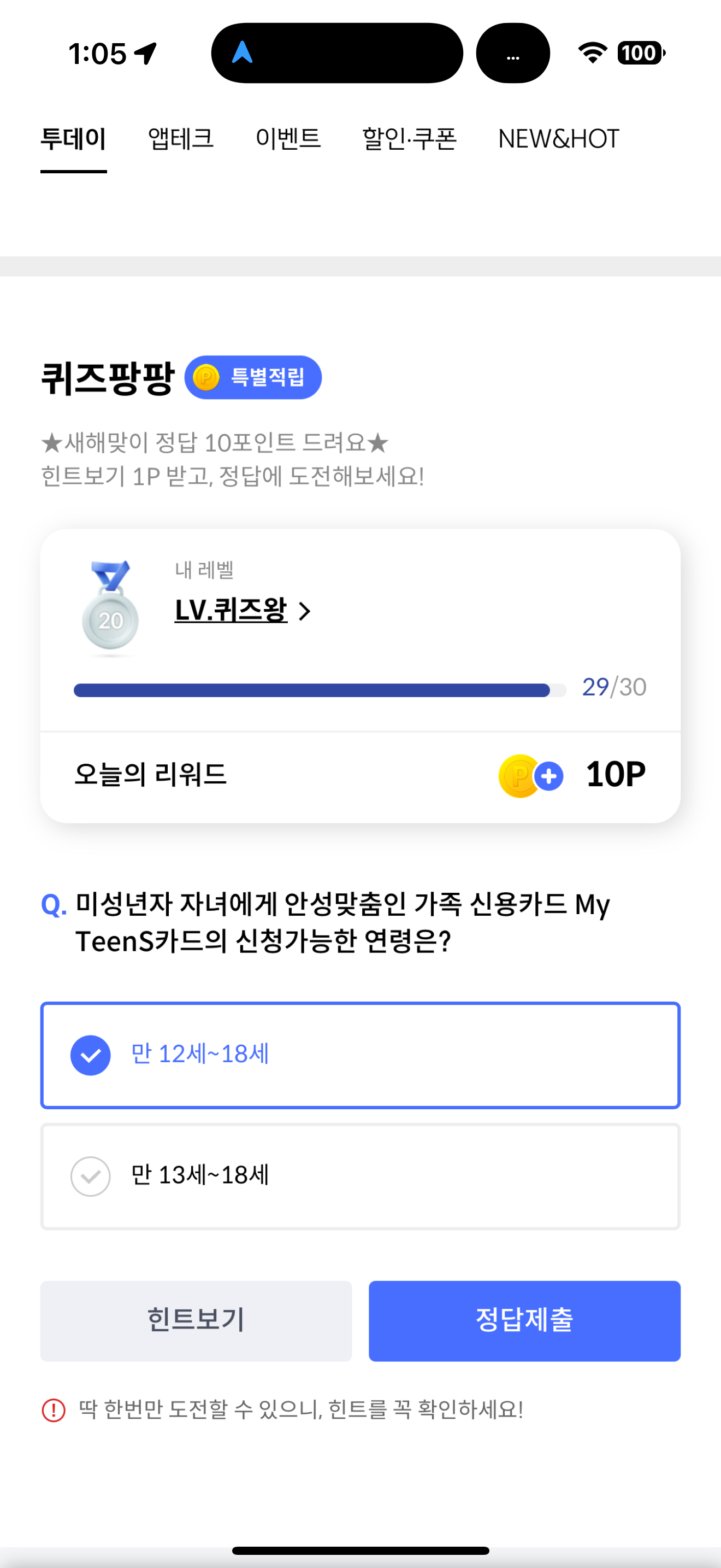 신한카드 퀴즈팡팡 정답은 만 12세~18세 입니다