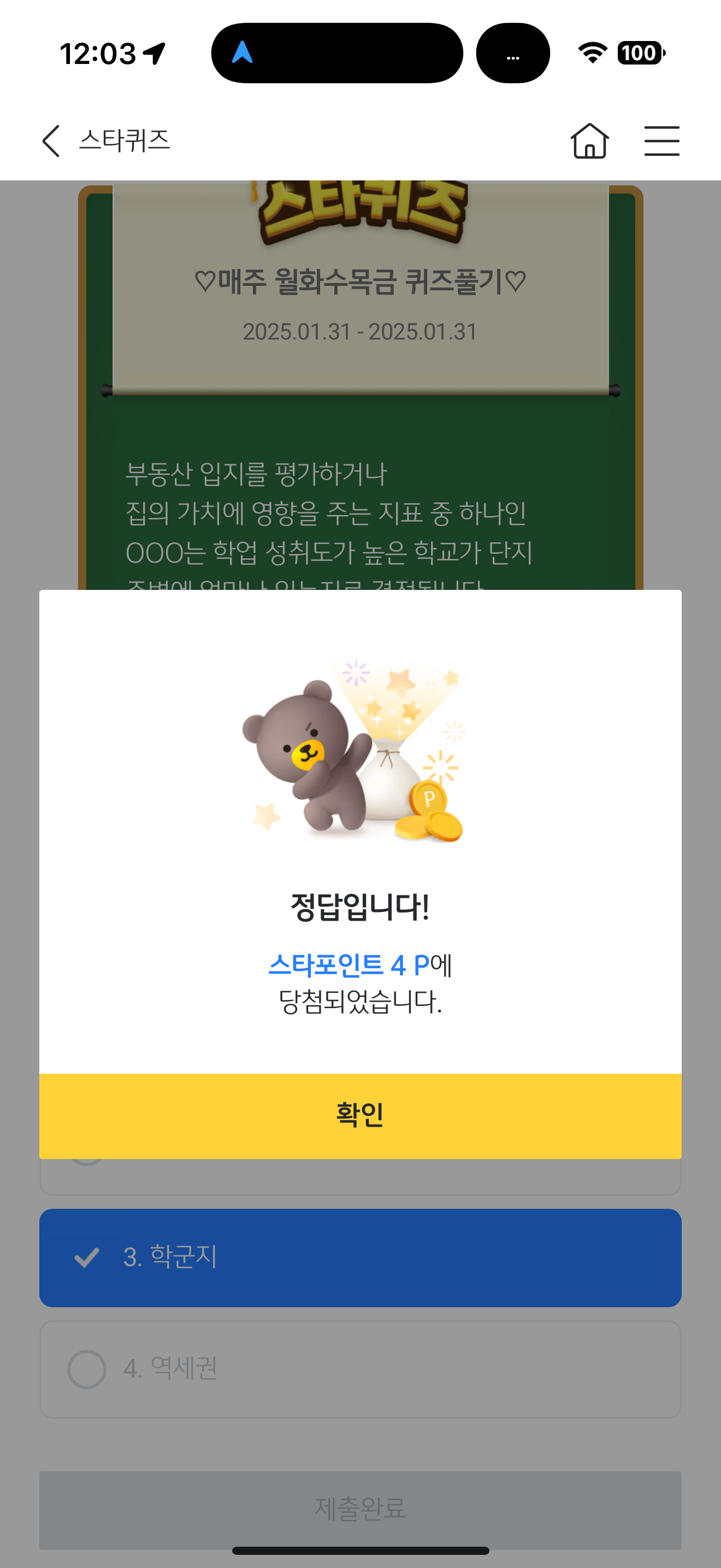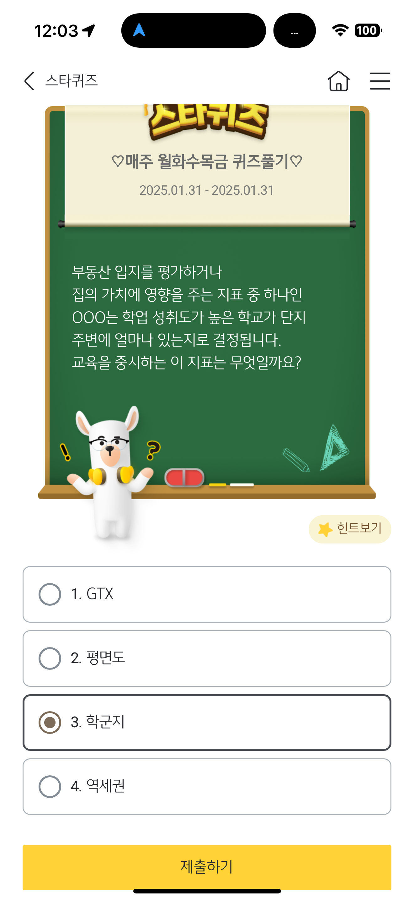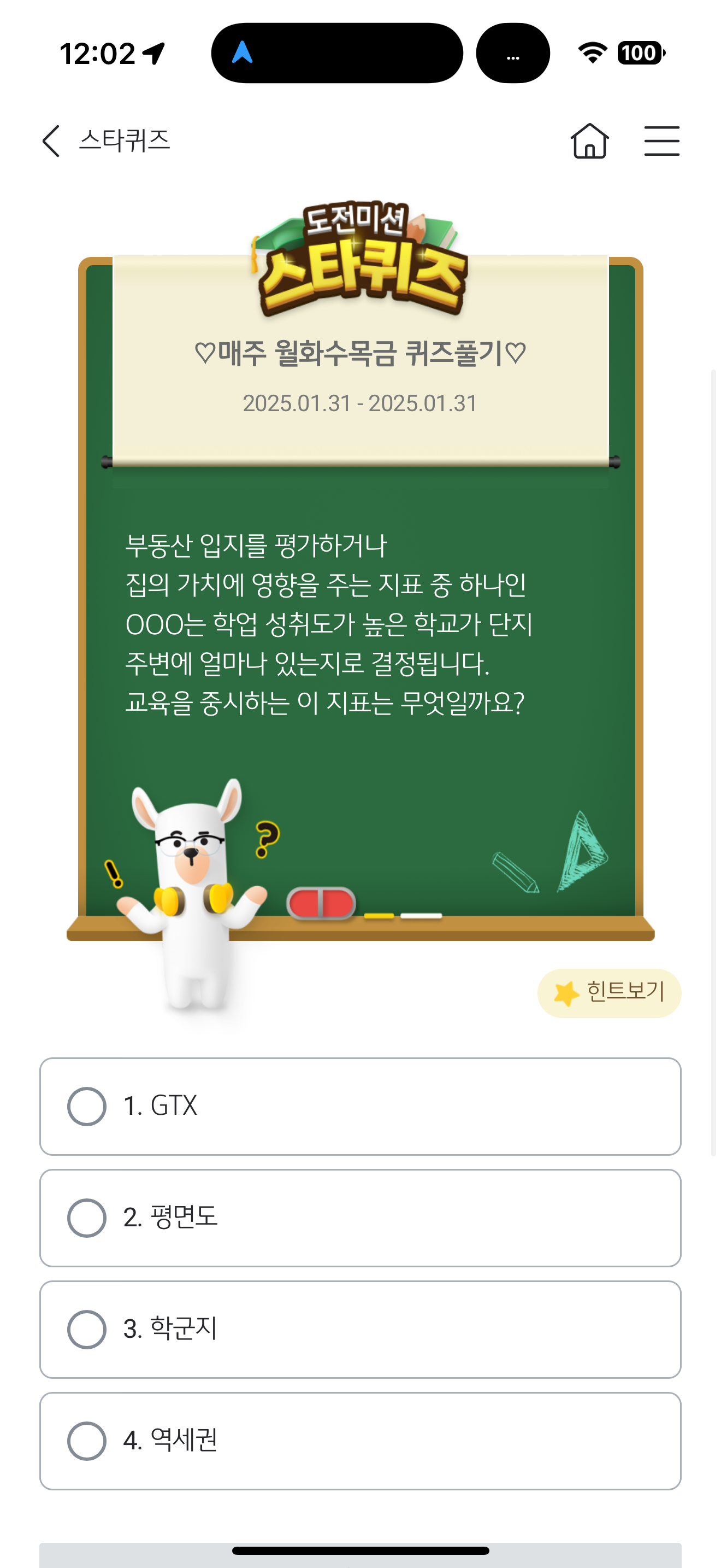 KB스타뱅킹 스타퀴즈 1월 31일 정답(부동산 입지를 평가하거나 집의 가치에 영향을 주는 지표 중 하나인 OOO는 학업 성취도가 높은 학교가 단지 주변에 얼마나 있는지로 결정됩니다. )