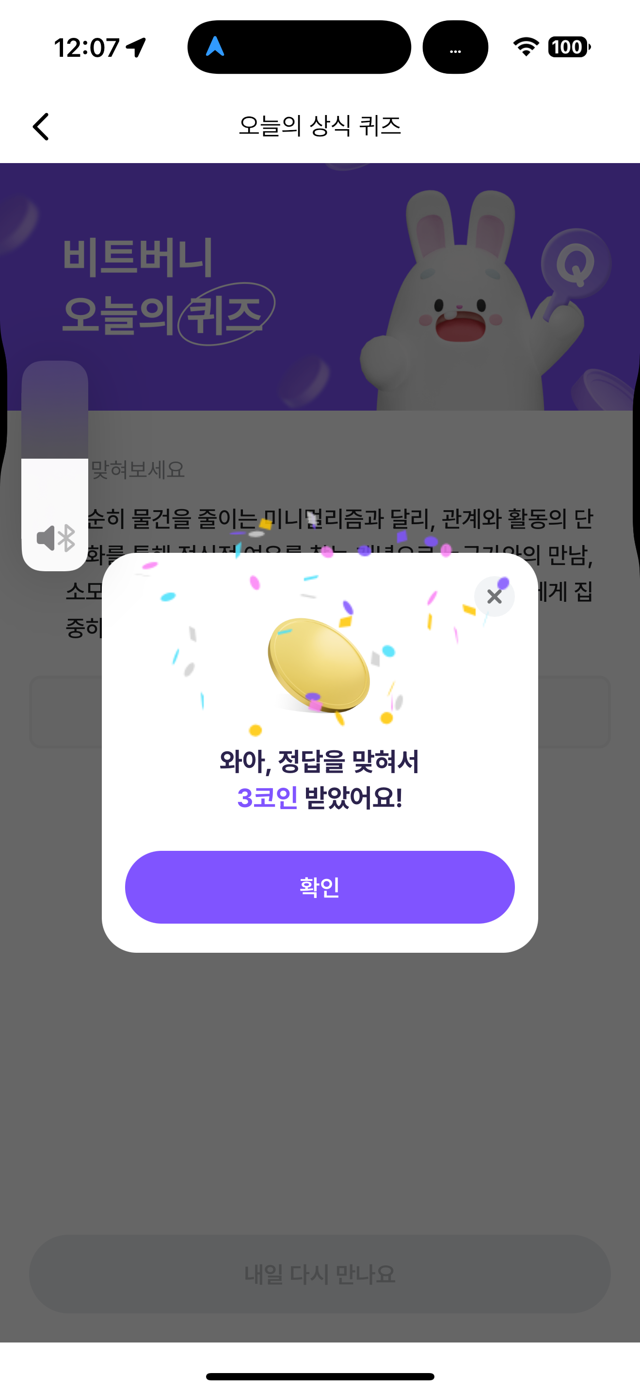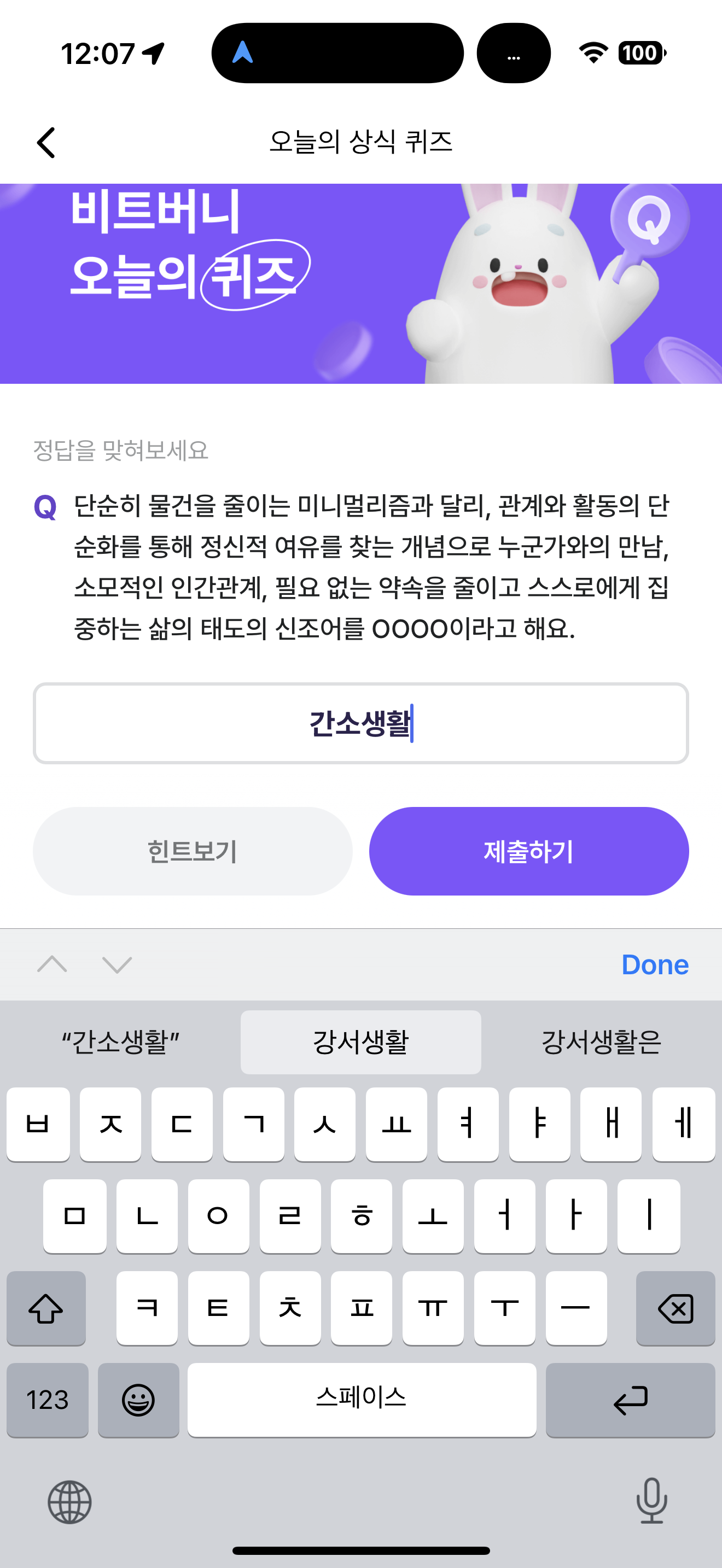 비트버니 오늘의 퀴즈 정답은 간소생활 입니다