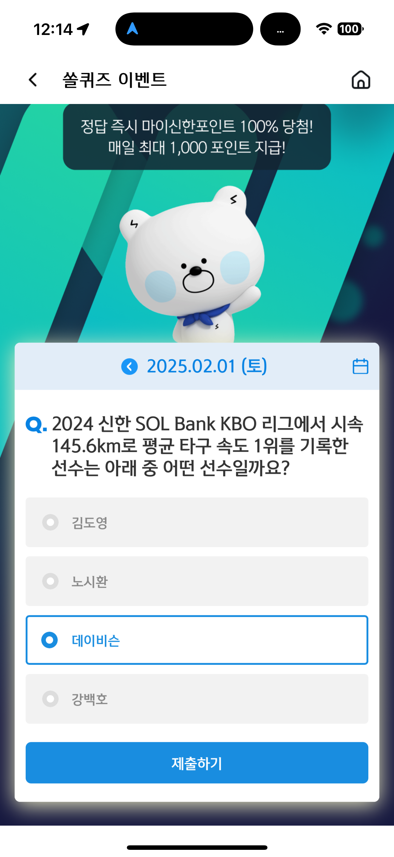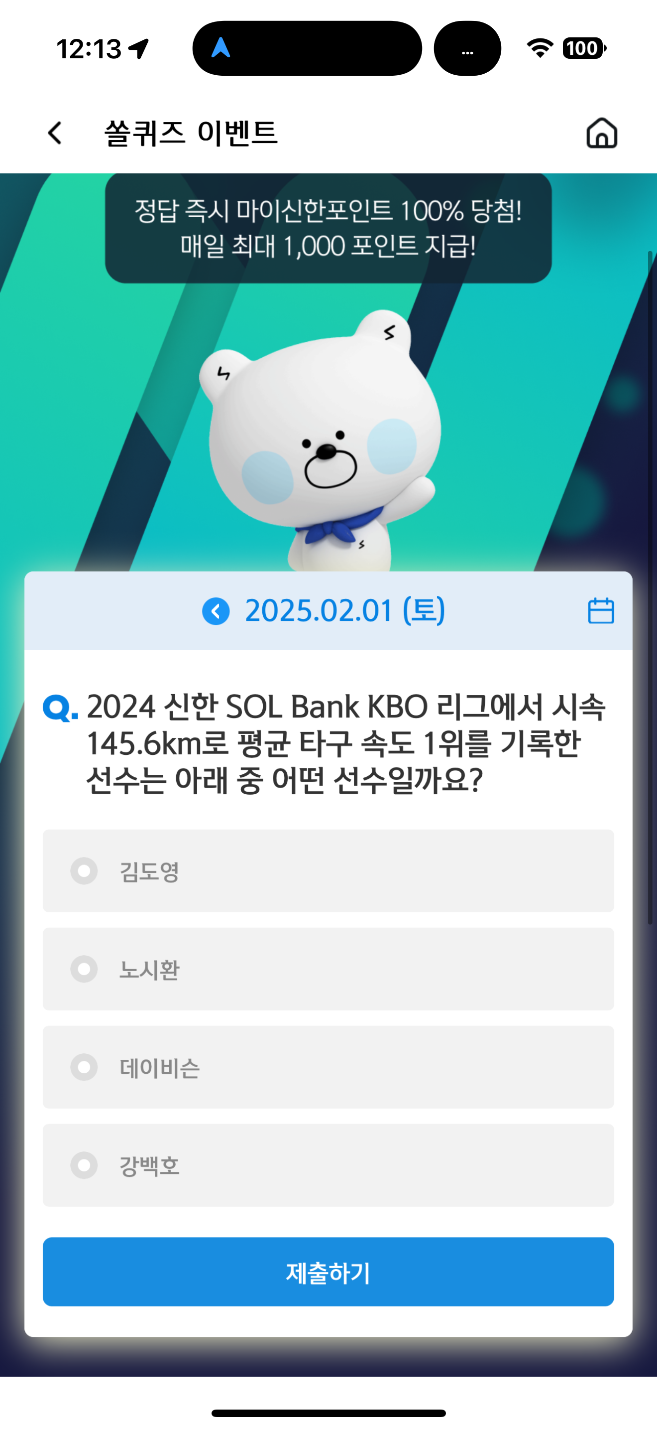신한 슈퍼SOL 야구/상식 쏠퀴즈 2월 1일 문제입니다