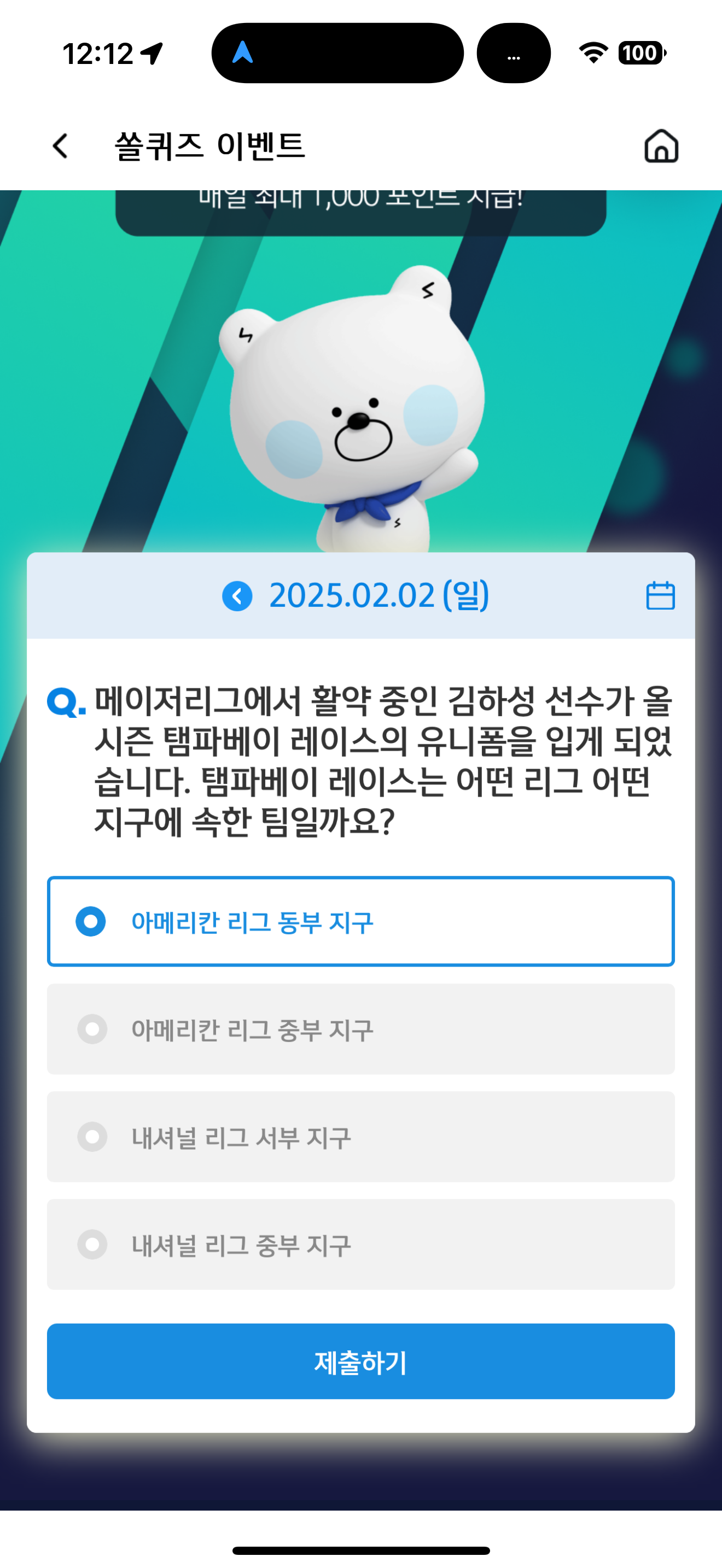 신한 슈퍼SOL 야구/상식 쏠퀴즈 정답은 아메리칸 리그 동부 지구 입니다