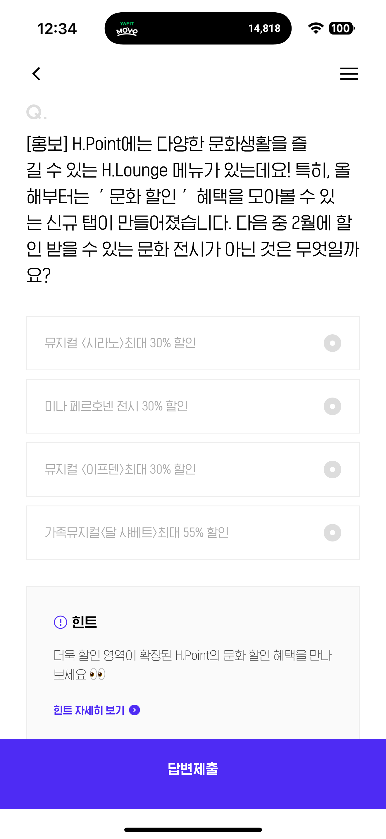 H포인트 퀴즈 2월 2일 정답(H.Point에는 다양한 문화생활을 즐길 수 있는 H.Lounge 메뉴가 있는데요! 특히, 올해부터는 ' 문화 할인 ' 혜택을 모아볼 수 있는 신규 탭이 만들어졌습니다. 다음 중 2월에 할인 받을 수 있는 문화 전시가 아닌 것은 무엇일까요?)