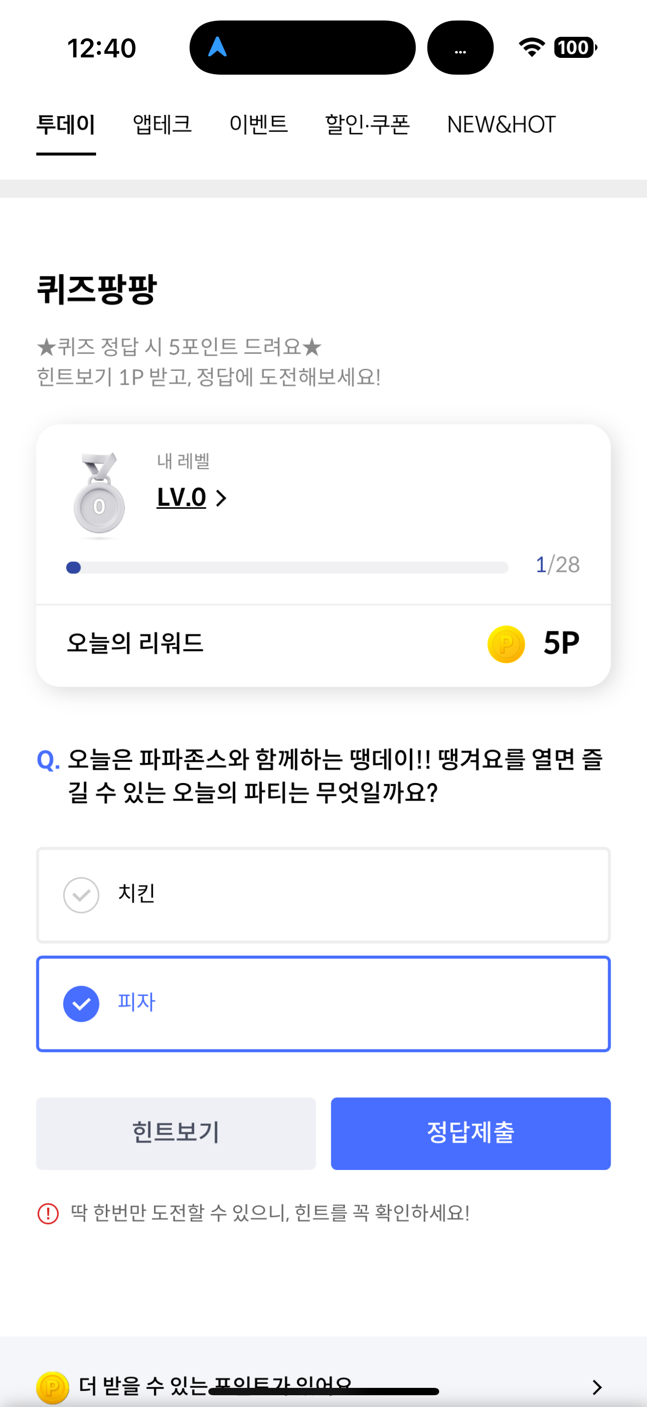 오늘은 파파존스와 함께하는 땡데이!! 땡겨요를 열면 즐길 수 있는 오늘의 파티는 무엇일까요? 보기는 1. 치킨 2. 피자 입니다. 파파존스하면 뭐죠. 땡겨요 앱에서는 파격적인 할인 혜택을 제공하니 잘 참고하셔서 활용해 보세요. 오랜만에 득템할 수 있는 기회입니다
