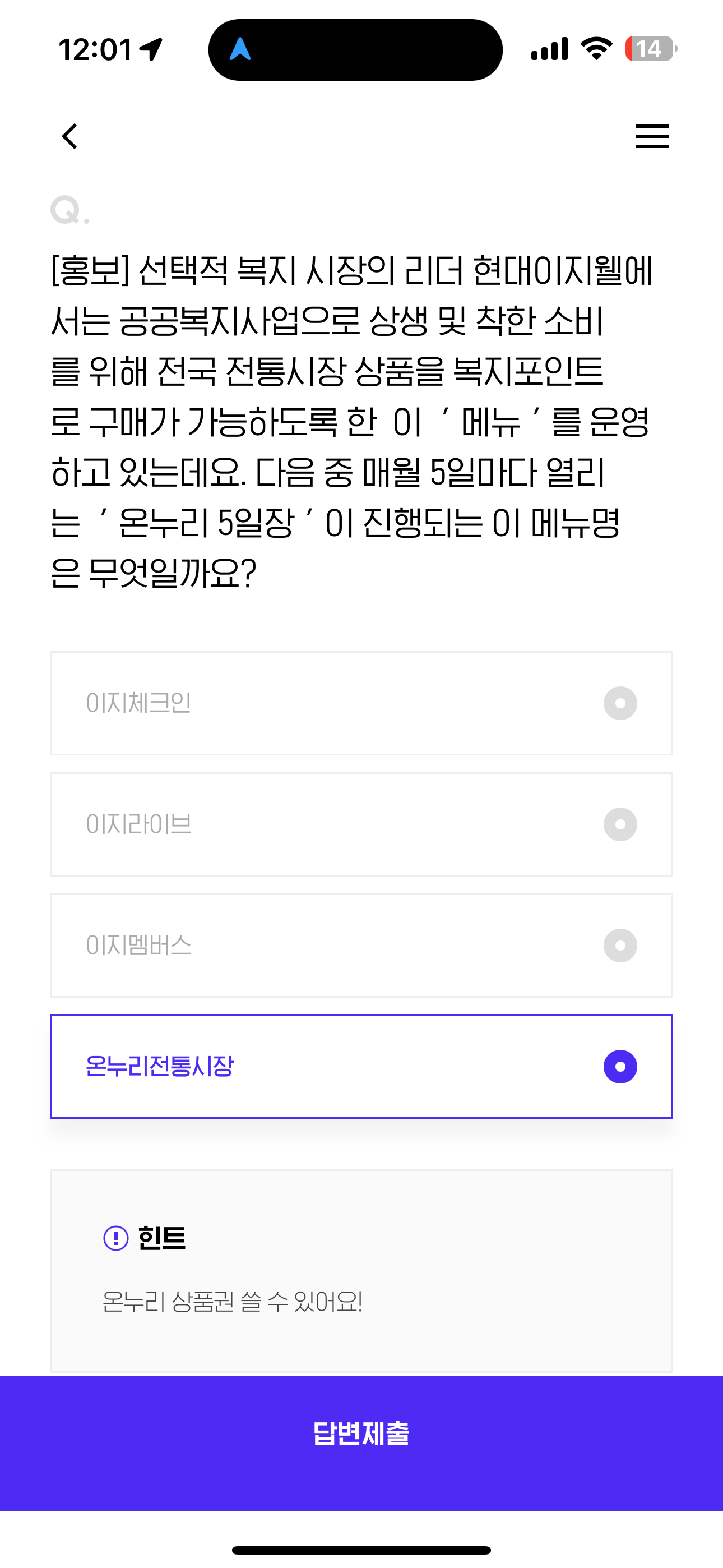 [홍보] 선택적 복지 시장의 리더 현대이지웰에서는 공공복지사업으로 상생 및 착한 소비를 위해 전국 전통시장 상품을 복지포인트로 구매가 가능하도록 한 이 ' 메뉴 ' 를 운영하고 있는데요. 다음 중 매월 5일마다 열리는 ' 온누리 5일장 ' 이 진행되는 이 메뉴명은 무엇일까요? 보기는 1. 이지체크인 2. 이지라이브 3. 이지멤버스 4. 온누리전통시장 입니다 .