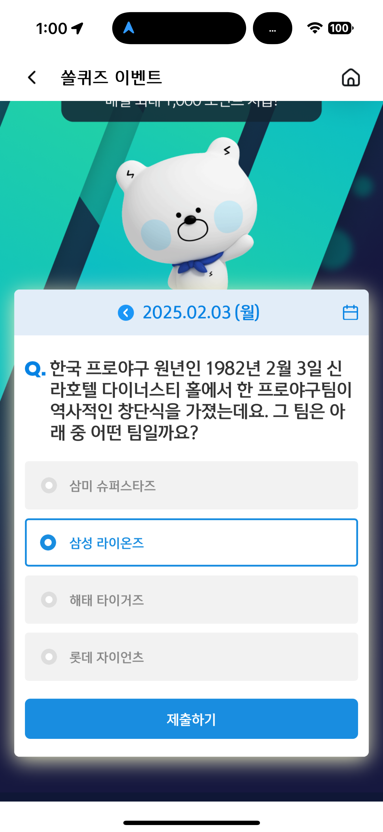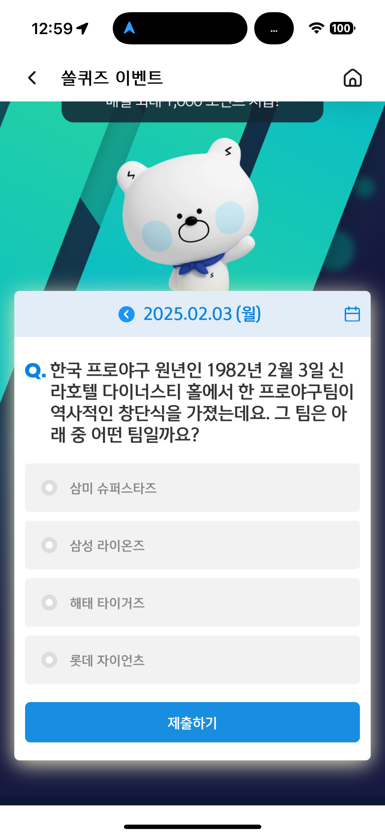 신한 슈퍼SOL 야구/상식 쏠퀴즈 정답은 삼성 라이온즈 입니다
